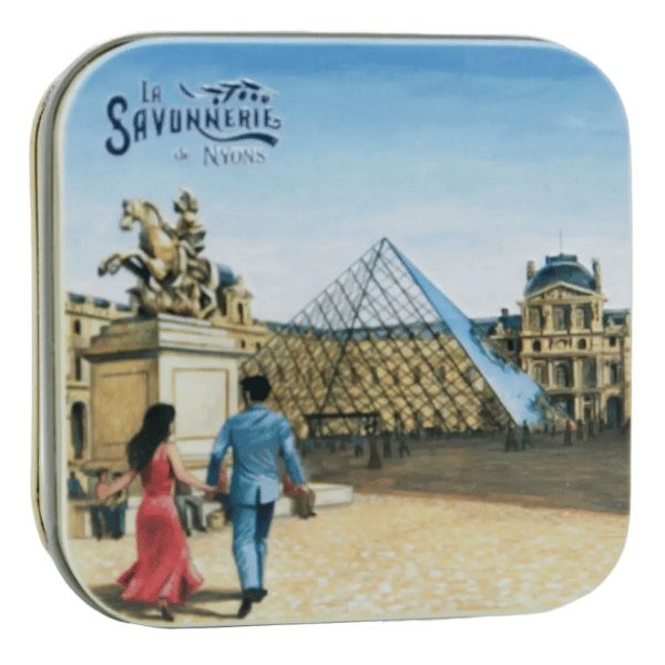 Introducing our 3.5oz Cotton Flower Soap in the elegant “Le Louvre” Tin Box. Designed by local artist Luc Mazan, this vintage-style metal box pays homage to the universe of the Louvre museum. Inside the tin box, you’ll find our 3.5oz Cotton Flower scented soap, enriched with organic shea butter for its softening and protective properties. Indulge in a moment of pure well-being as you bathe and allow the delicate fragrance to envelop your skin throughout the day. Our metal tins are a specialty of La Savonnerie de Nyons, offering a unique and reusable storage solution once the soap is finished. The “La Pyramide” tin box is a perfect gift for art enthusiasts and lovers of the Louvre Museum, showcasing our signature vintage style. Handcrafted with care in our soap factory located in Nyons, Provence, this soap represents the finest French craftsmanship.