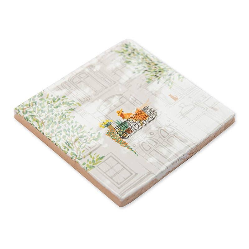 This is my favorite spot. When I sit here I feel calm, relaxed and happy. Feel free to drop by, we’ll have a drink and talk a bit! Ceramic tiles have been made in and around Delft, The Netherlands, since the 16th century. StoryTiles continues the tradition by creating miniature art-on-tiles. All tiles are baked in traditional Dutch ovens at a high temperature, what makes them heat and water resistant.