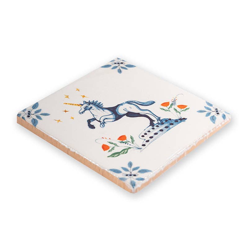Unicorns are the most unique creatures of all time. You don’t see them often, so if you see one, you’re lucky because they cross your path for a reason…! Ceramic tiles have been made in and around Delft, The Netherlands, since the 16th century. StoryTiles continues the tradition by creating miniature art-on-tiles. All tiles are baked in traditional Dutch ovens at a high temperature, what makes them heat and water resistant. Each design is unique, as it is hand baked and designed. The delicate art pieces come in very cool cardboard packaging, with a nifty hanging system. Almost all StoryTiles are available in two sizes: Small: 10 x 10cm Medium: 13 x 13cm* *This size is equivalent to the original Dutch tile.