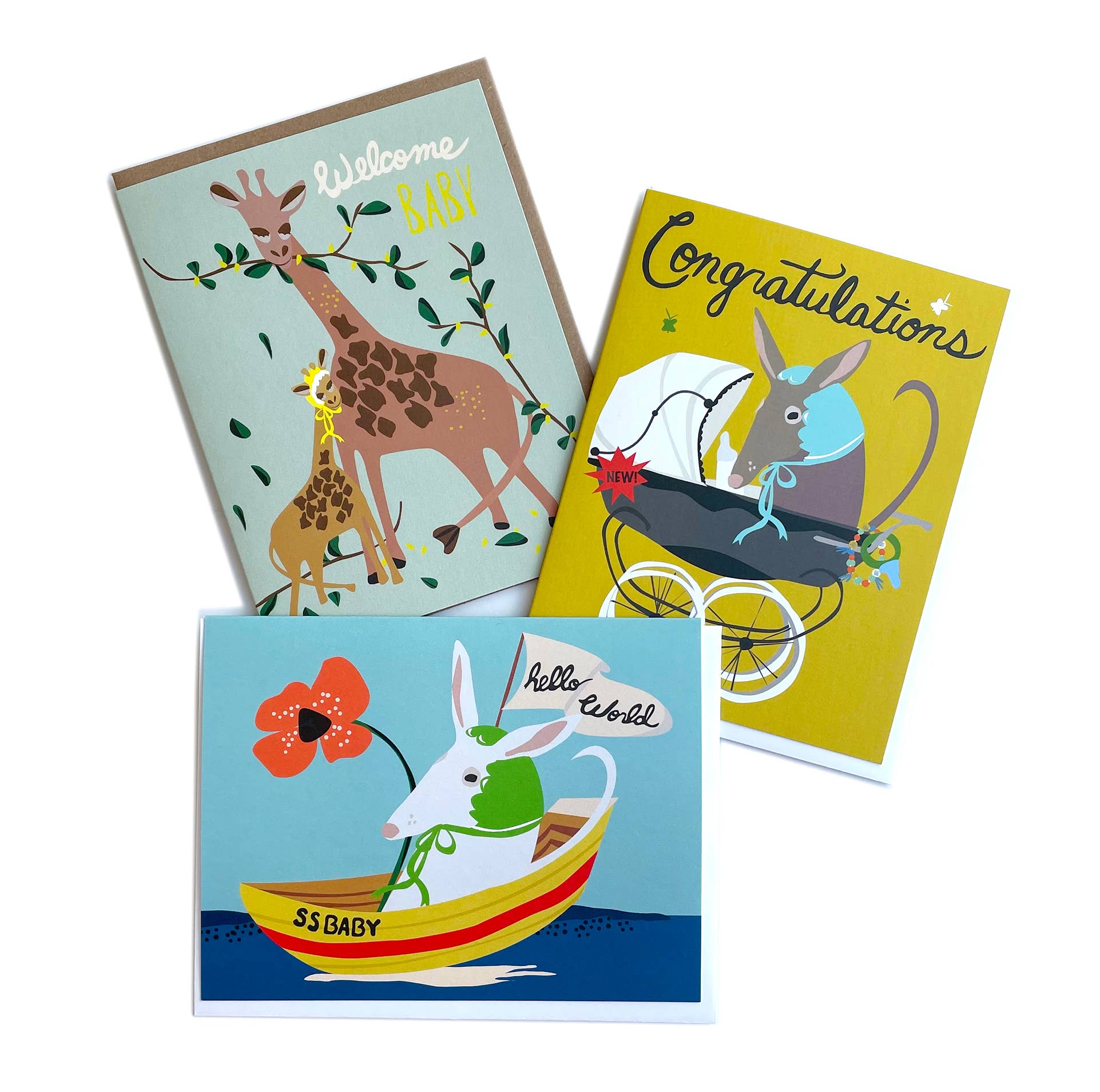 New baby in a pram. Blank on the inside. Complete with a crisp white envelope. 5.5 x 4.25 inches folded. FSC certified + PCW recycled mix.