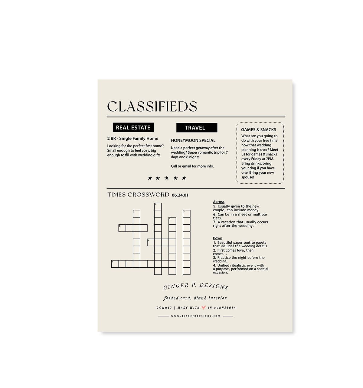 Hot off the press! Our Newlywed Times card is witty and adorable – even has a real crossword puzzle on back. Full – color 4.25″ x 5.5″ folded cards. Blank interior. Antique gold shimmer envelope