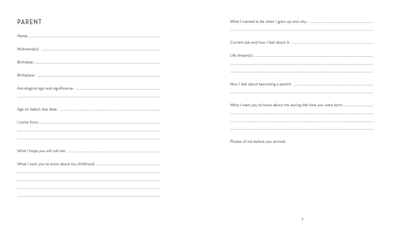 My Baby’s Book focuses on baby’s delivery and first few years. Prompts include a mix of short-answer questions, lists, fill in the blanks, and places for photos to record pregnancy/anticipation of the birth, arrival, family info, observations about baby’s appearance and temperament, firsts, growth milestones, home, family friends, and baby playmates. When complete, you’ll have a nuanced portrait of your baby’s life through reflections, memories, history, and stories–a keepsake to be cherished throughout their life.
