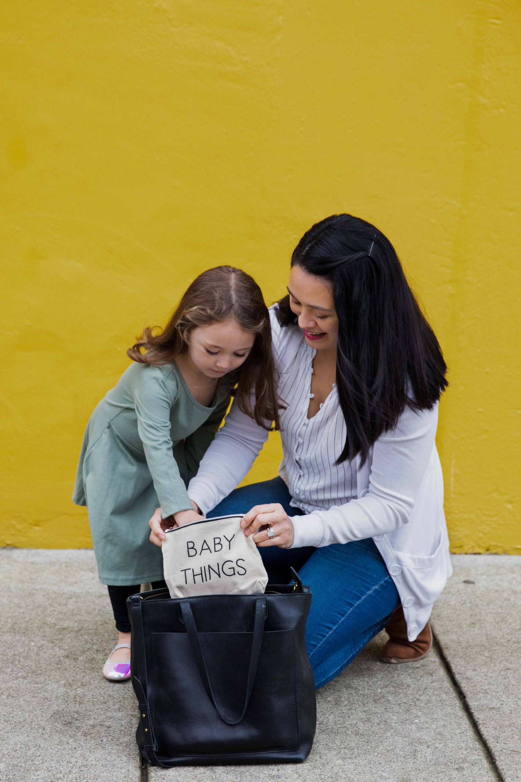 • “mommy things” printed in black on one canvas and “baby things” printed in black on the other canvas
