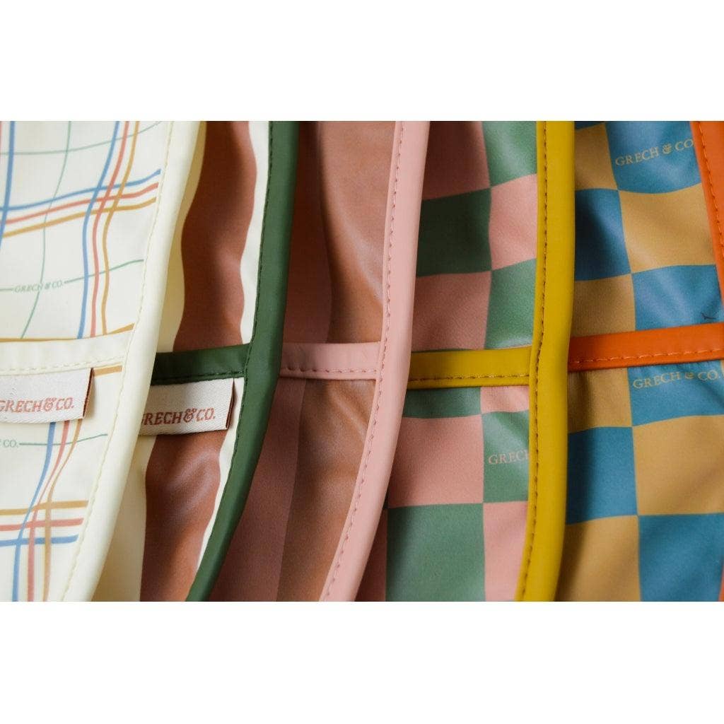 Keep mealtimes cleaner and more fun for all with the Grech & Co. easy to clean and store bib. Featuring a catch-all front bib pocket and water resistant OEKE-TEX material.