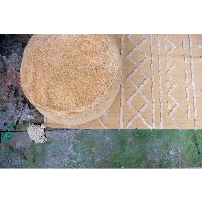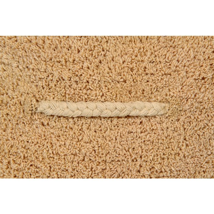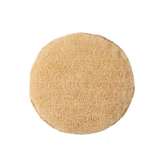 Round pouffe in Honey color with a handmade braid in matching color as a handle. Top and sides covered with soft rug pile, bottom part in cotton canvas, and finished with a zipper. Inside removable filler with polystyrene pearls.