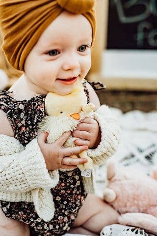 Meet Peep! Your teeny plush friend who is perfectly sized for small hands. Peep Roly Poly is a yellow furry chick stuffed animal with hand embroidered face and dangly, knotted arms and legs.