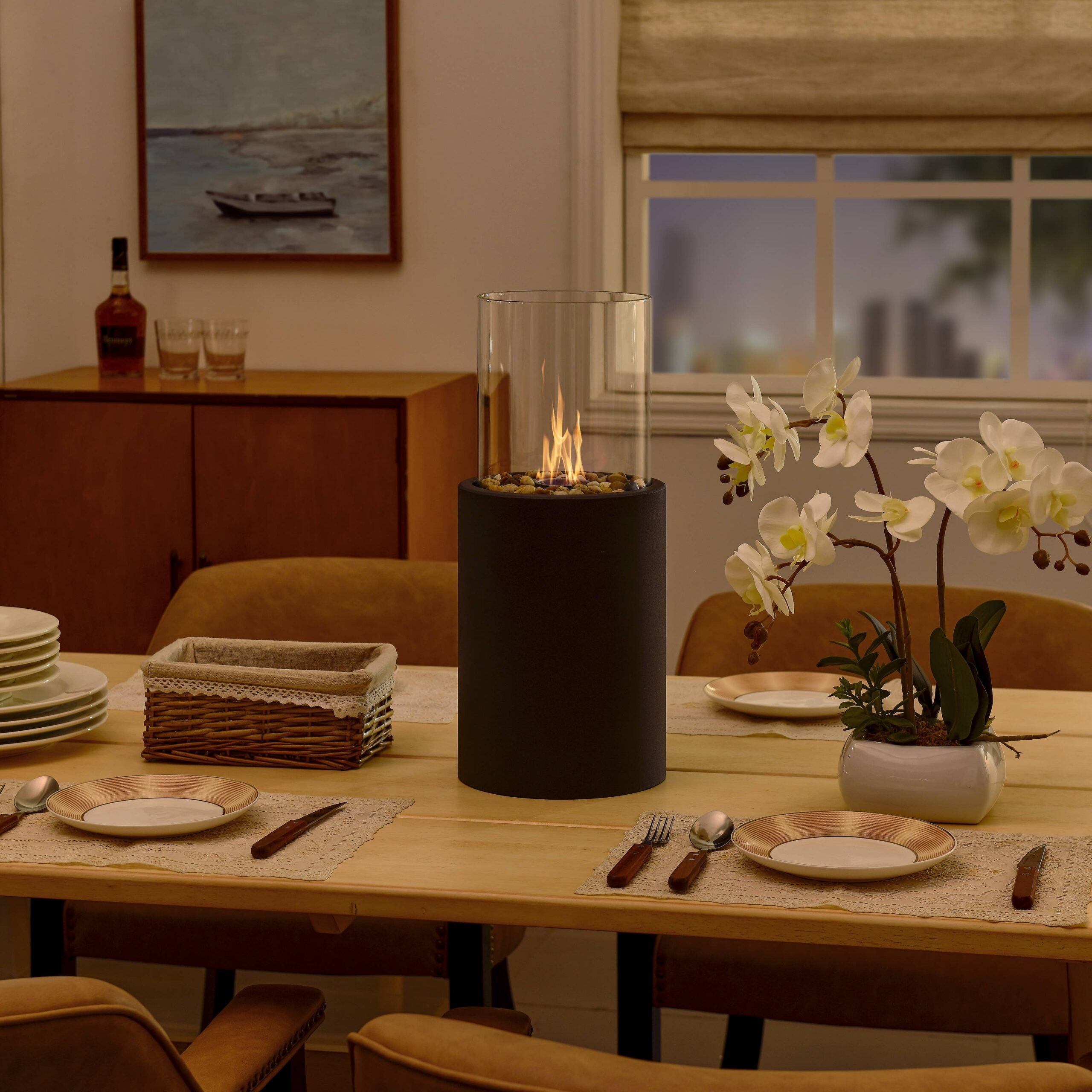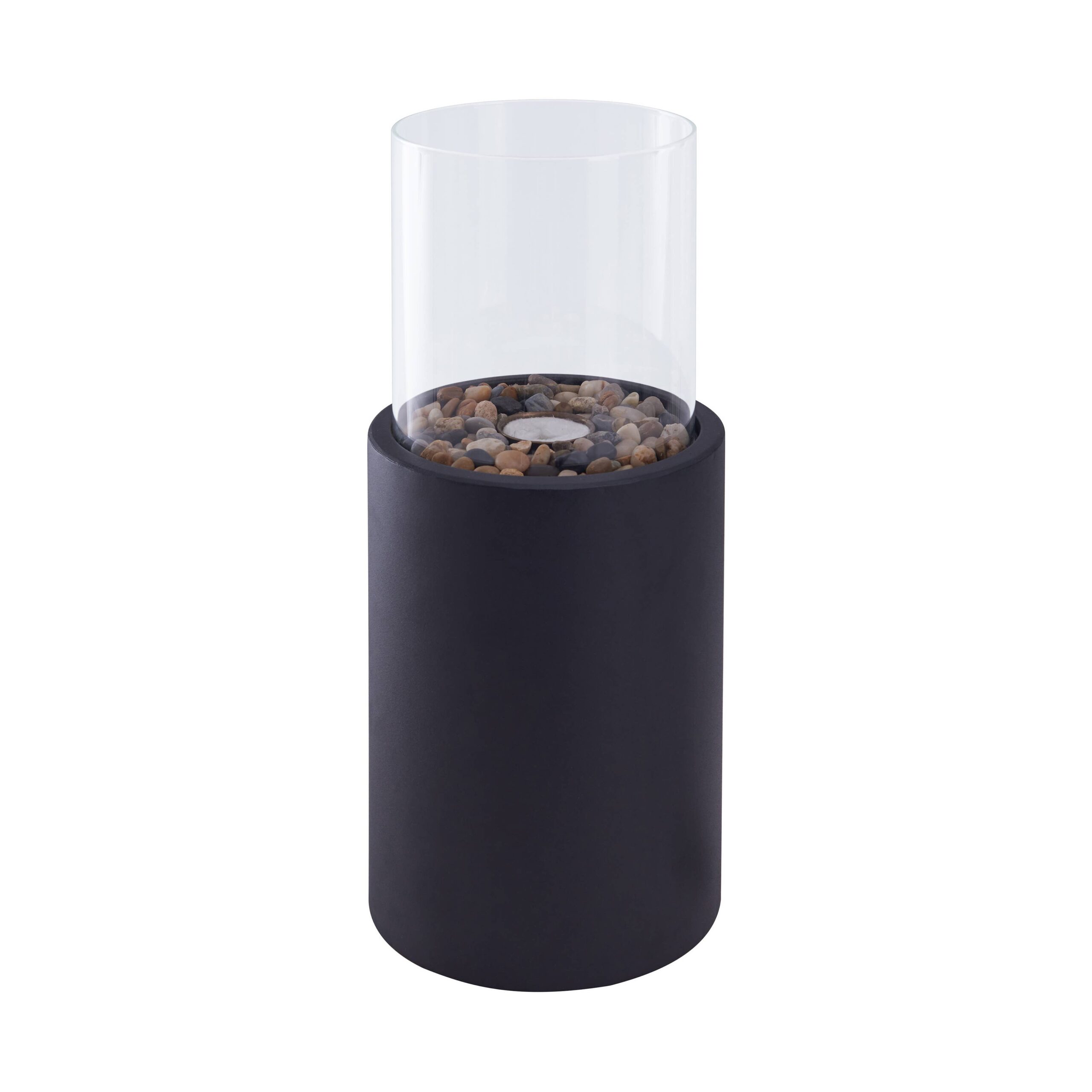 Easy and economical, the Small Danya B. Indoor / Outdoor Portable Tabletop Fire Pit is a great way to generate warmth in your living space while also adding a touch of sophistication to your ambiance. Modern in every sense of the word, this elegant tabletop fireplace sports a sleek black metal base, a removable cylindrical glass body, and reusable fiberglass for use with ethanol fuel (not included), decorative rocks and a sniffer. Enjoy the ambiance of real fire without the inconvenience of melting wax, smoke, soot, and ash. The Danya B. Tabletop Fire Pit is a modern, portable, and ventless way to create an ambient atmosphere both indoors and outdoors. Enjoy a clean-burning and odorless flame without worrying about smoke, soot, or ash. Featuring a sleek black metal base, a removable cylindrical glass body, and reusable fiberglass, this tabletop fireplace is designed to bring warmth and sophisticated style to any space! Get the ambiance of real fire with none of the hassle.