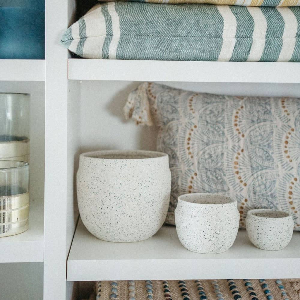 Specks of green and blue glass bring a terrazzo look to the modern stoneware Speckle Classic Pots. We love them inside or out when planted with kitchen herbs. No drainage hole.