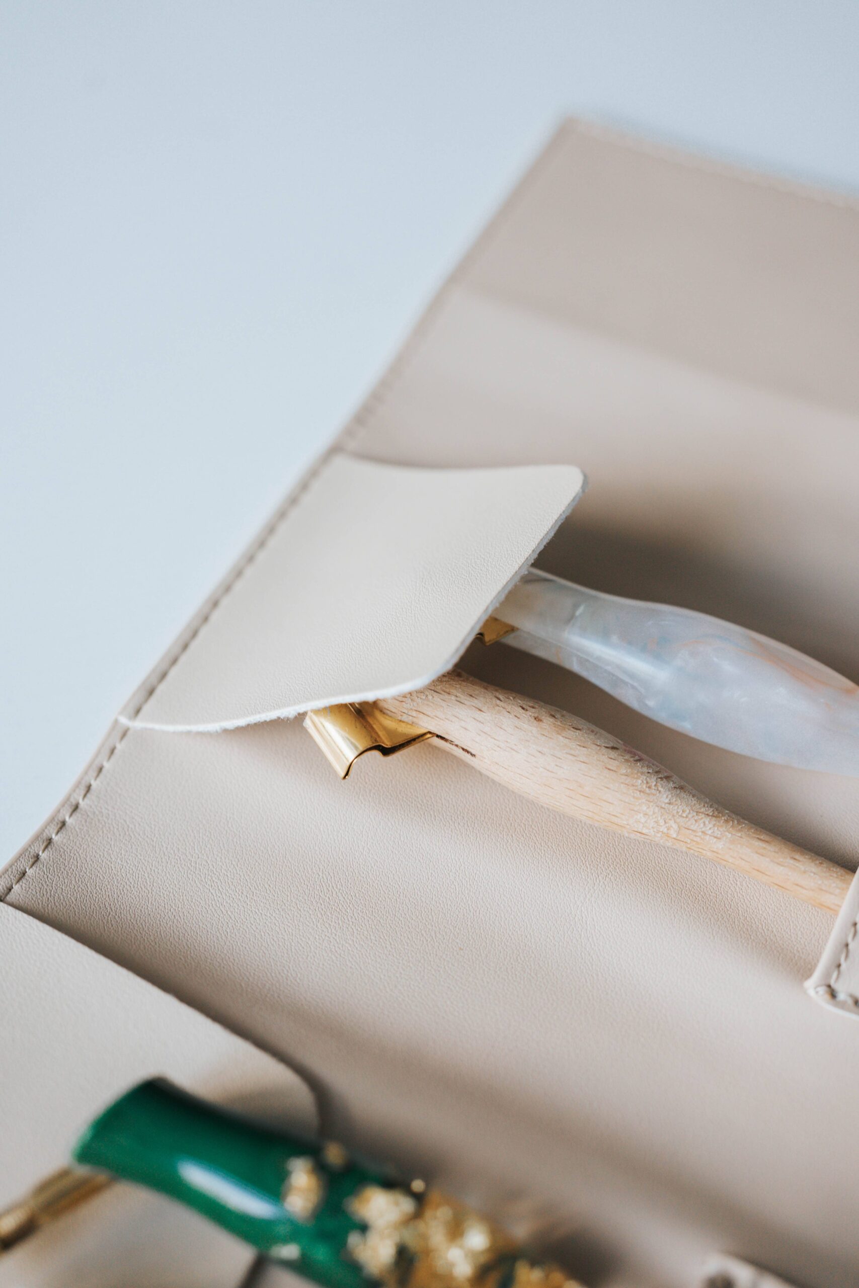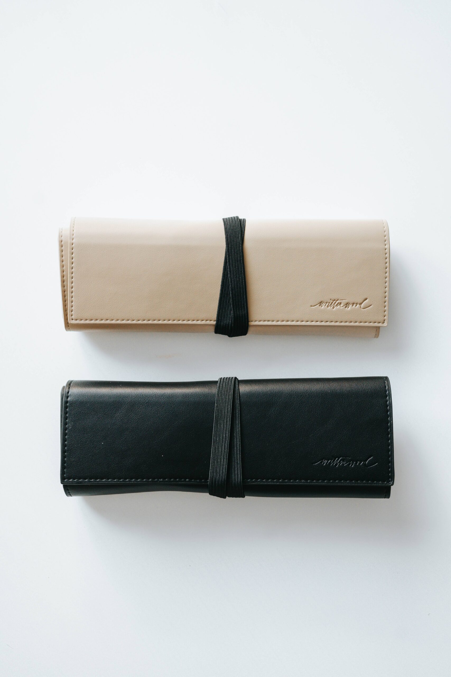 This calligraphy pen roll is bound in the luxurious vegan leather debossed with our logo, Written Word Calligraphy. Available in Beige and Black. It has 3 sections – first with two button enclosures, and then two sections with pen slots with a cover to prevent things from falling out. It has a sectional design for ease of “rolling”. It has an elastic strap that can be tucked in to hold the roll together. It is lined with a durable wipeable material.