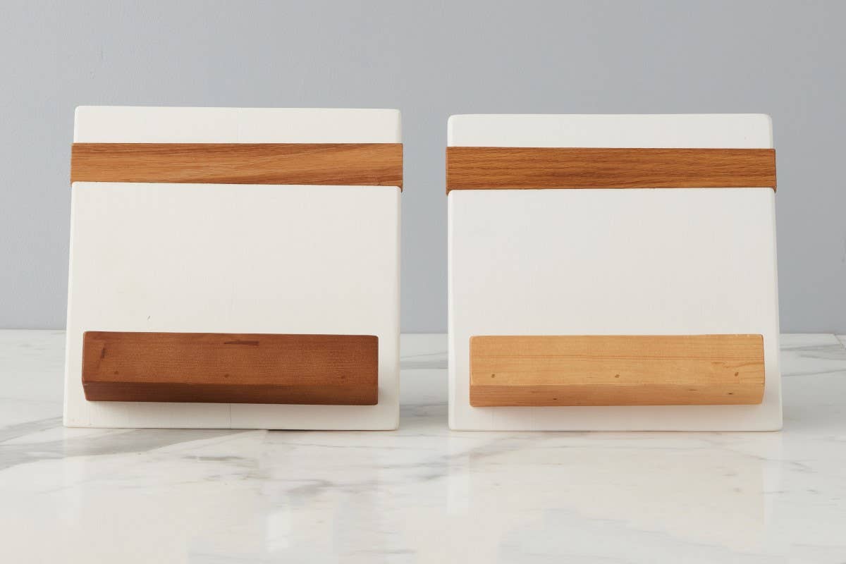 Beauty meets function: our Mod iPad + Cookbook Holder is the new countertop staple. Made of reclaimed wood and finished with a 100% plant-based, food-safe wax, the cookbook stand is adorned with a hardwood slat in the backrest to match the aesthetic of our charcuterie boards. The ledge, backrest and kickstand are made from sustainably sourced pine. As they are 2 different woods, there will be variances in the color tones.