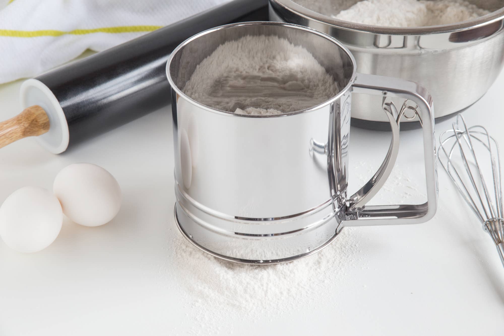 • THE MORE THE MERRIER: 4 cup capacity, simply squeeze handle to deploy the sifter inside. Not to mention, the easy to use hand crack allows for one-handed action.