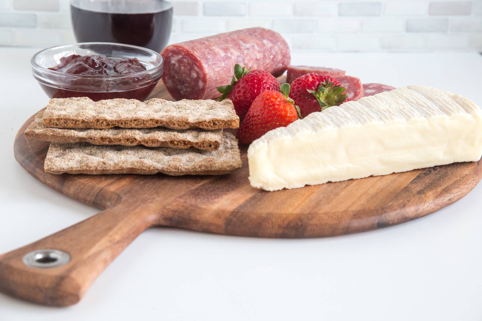 • AMERICAN DESIGNED: Made in Thailand and designed by a restauranteur and woodworker in North Carolina, this tray is a stunning accent perfect for serving any and all of your food needs. • ARTISAN AND UNIQUE: This wooden board is handcrafted from sustainably harvested gorgeous acacia wood, known for its unique and natural contrasting patterns. Its distinctive markings are beautiful and sleek, making it the perfect gift for any housewarming party or wedding. • VERSATILE AND MULTI-FUNCTIONAL: This board can be used for a variety of serving purposes. Try presenting cheeses, cured meats, olives, dried fruits, nuts, and crackers— or all of the above at once! • CONVENIENT GROMMET allows for simple wall-hanging and flexible storage options, so it’s ready to go when you are. • MEASUREMENTS: This beautiful round board weighs 1.1 pounds and has dimensions of 0.5 x 12 x 16 inches.