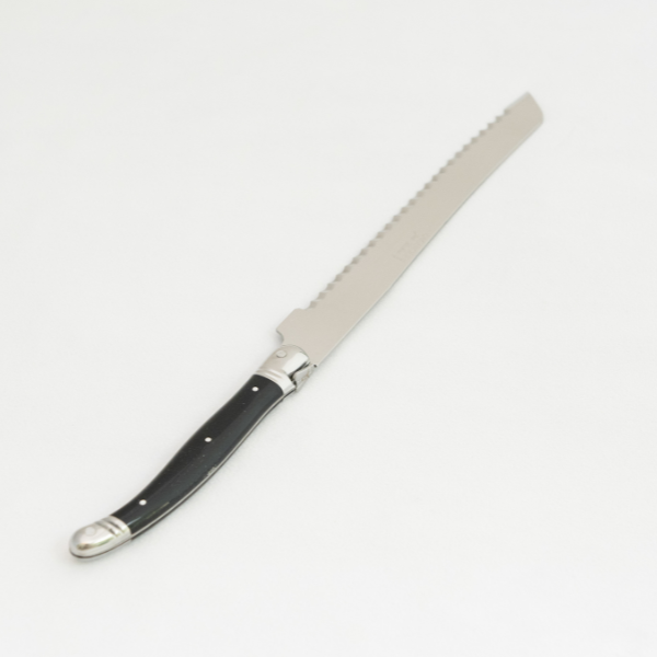 This bread knife, with it’s serrated edge, will slice through the toughest of breads with ease. This knife has a black handle, which gives it a classic look and feel. After going through 25 production processes, this knife is stamped, polished, and packaged. It is rust resistant, dishwasher safe, and will last a lifetime. ABS handles Stainless steel micro-serrated blades Stainless steel caps Certificate of Authenticity Care Instructions: We recommend washing your cutlery gently by hand under running hot water and to wipe it off immediately after. However, most of products, apart from those with natural wood handles, are dish-washer safe.