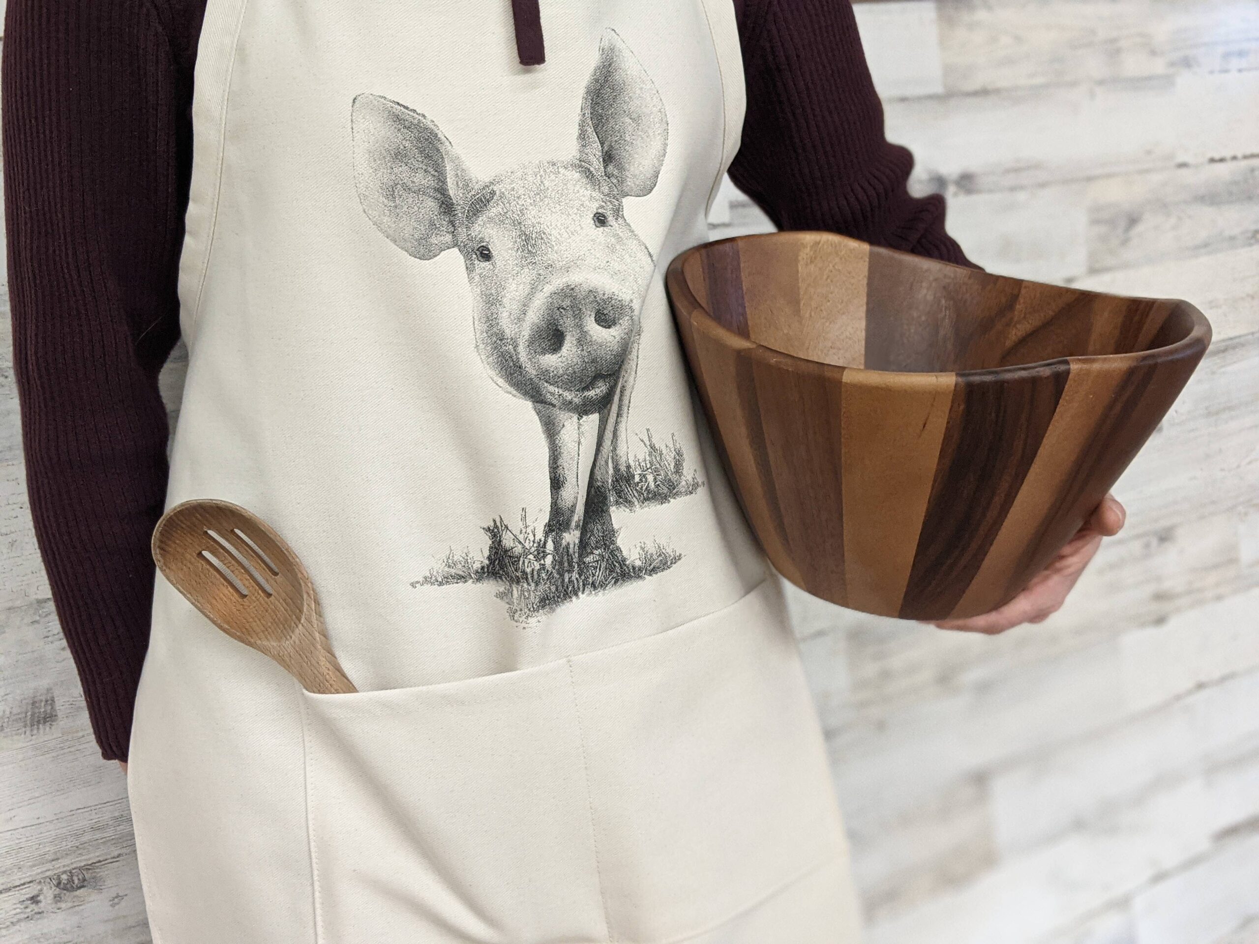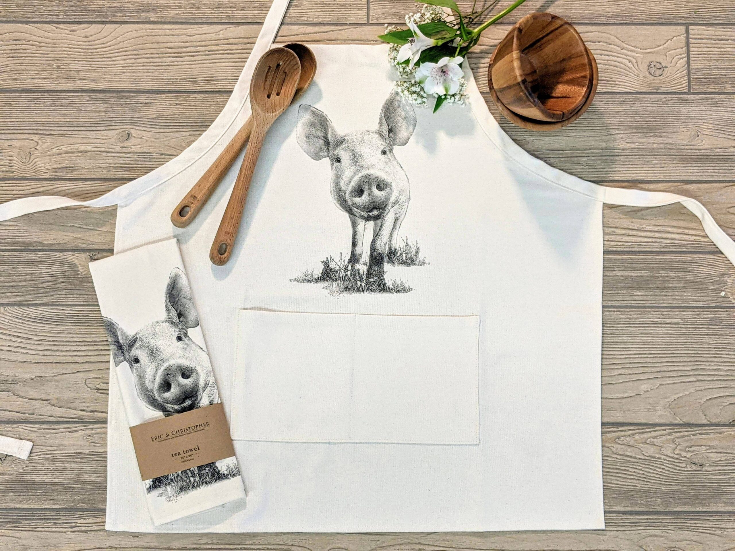Apron measures approximately 26″x26″ with 2 pockets that are each 6″ x 7″.