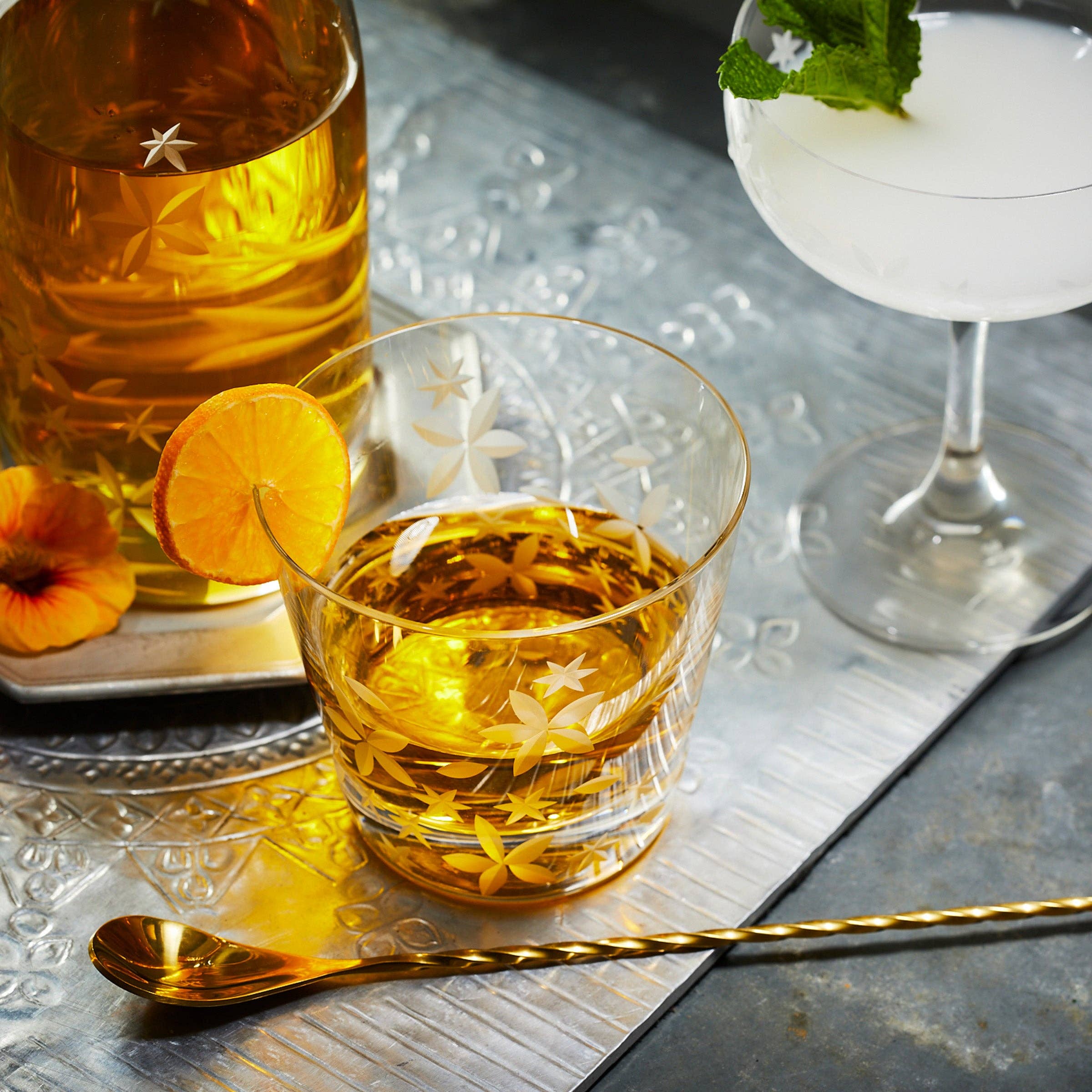 Chatham is a cocktail collection of reimagined retro shapes that feel both nostalgic and new. Bloom is a delicate floral pattern sand etched in lead-free crystal. Perfectly weighted, these are a dream to hold, and are ideal for your favorite rocks-style cocktail.