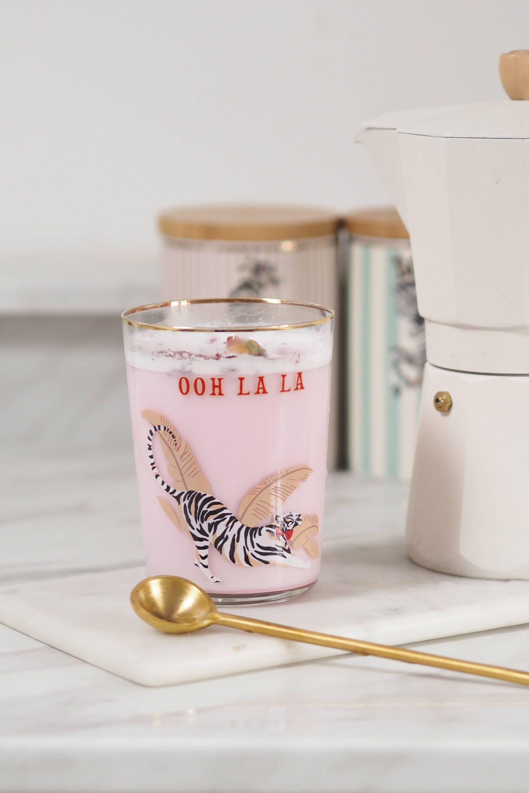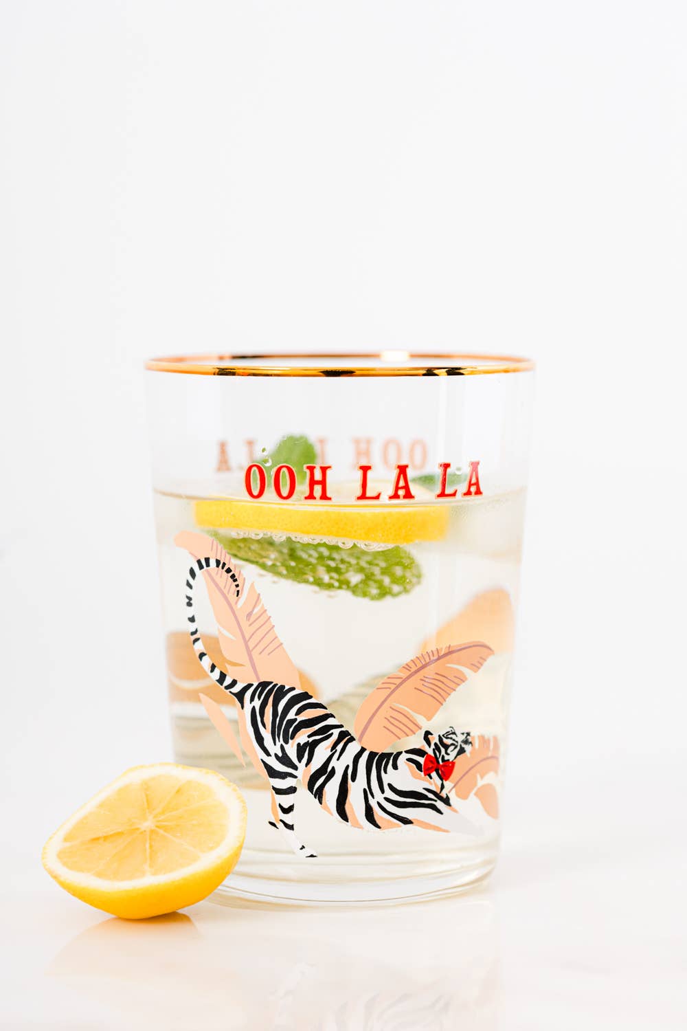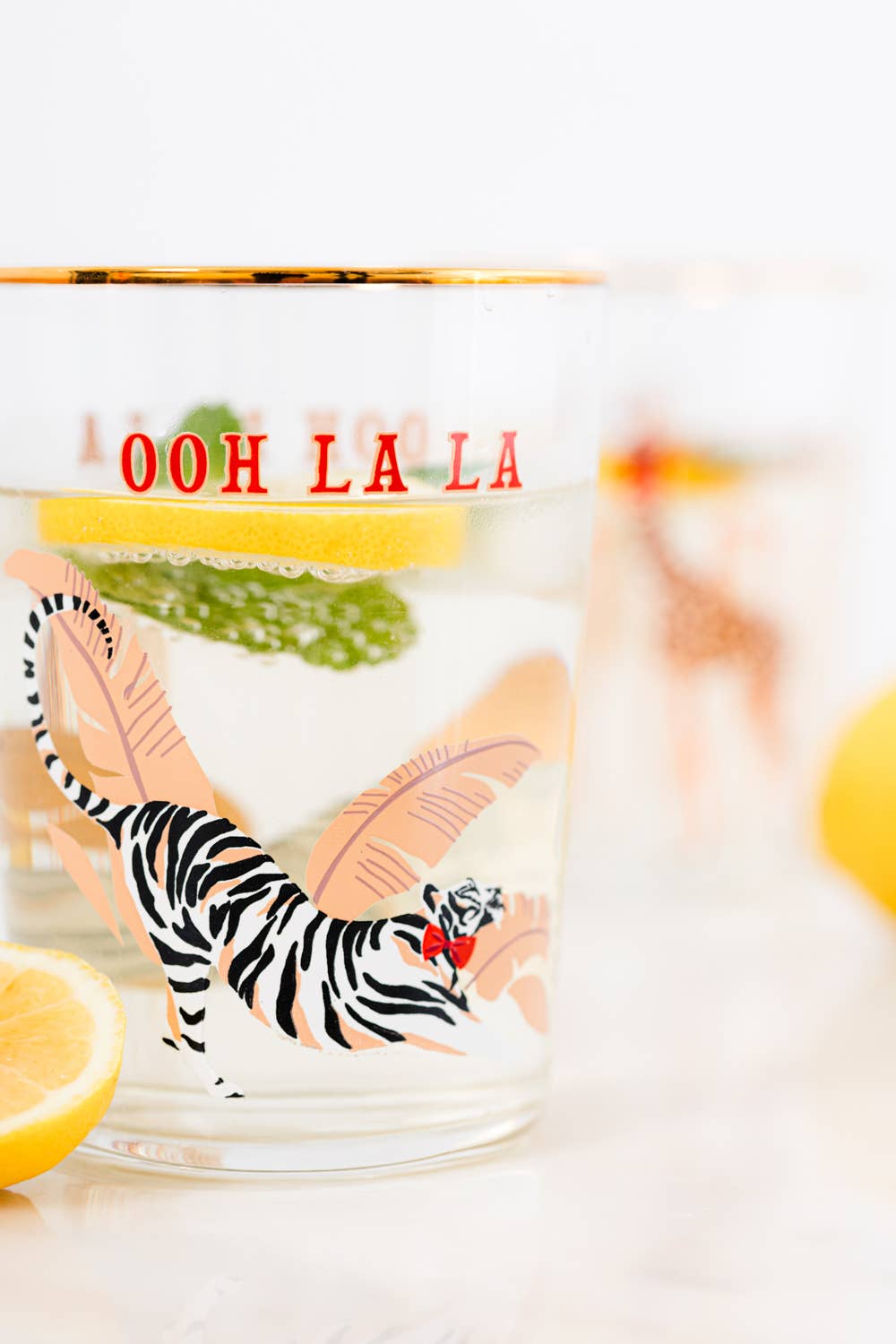 Unique and luxurious Yvonne Ellen Tiger glass complete with gilt gold edge detailing and colourful animal illustrations.