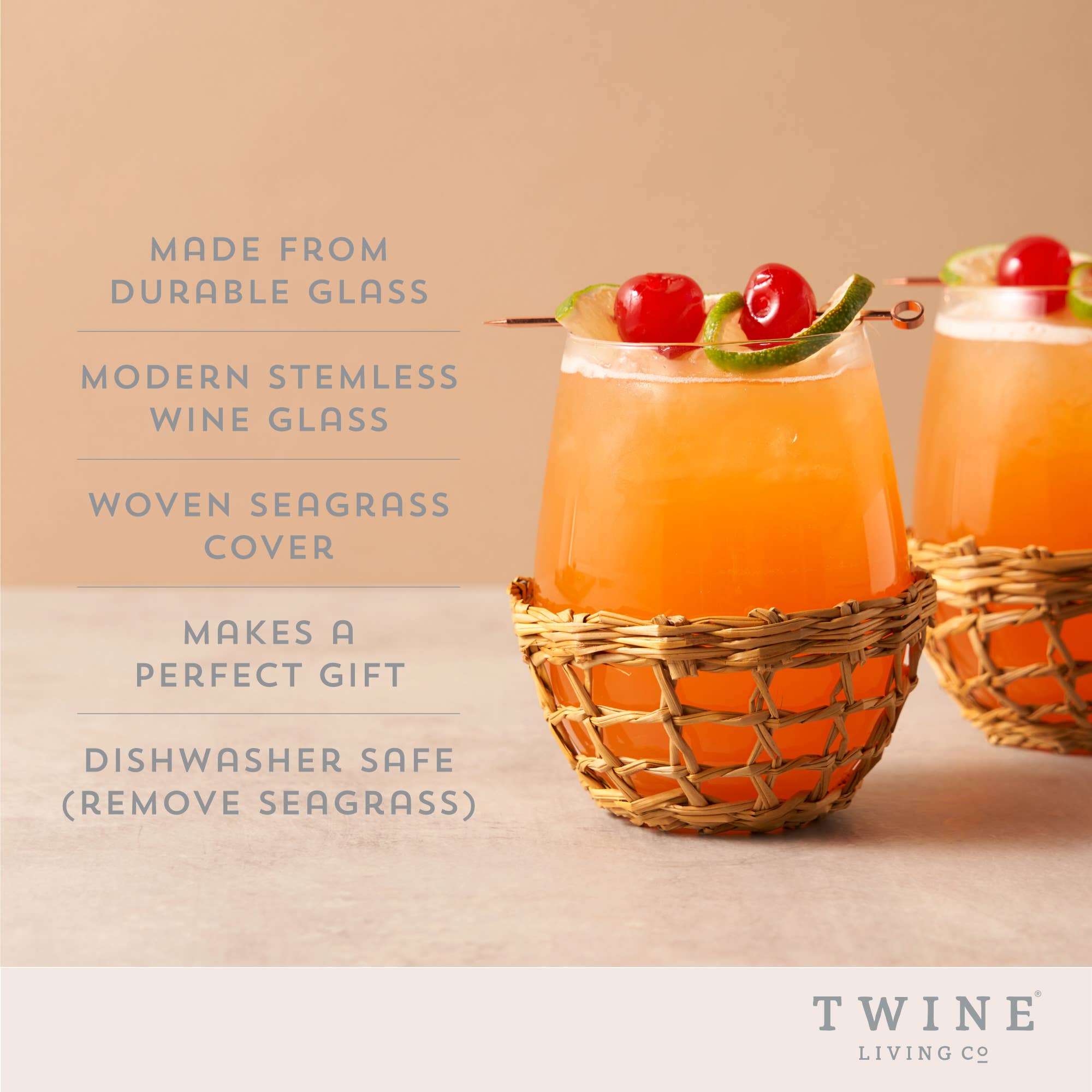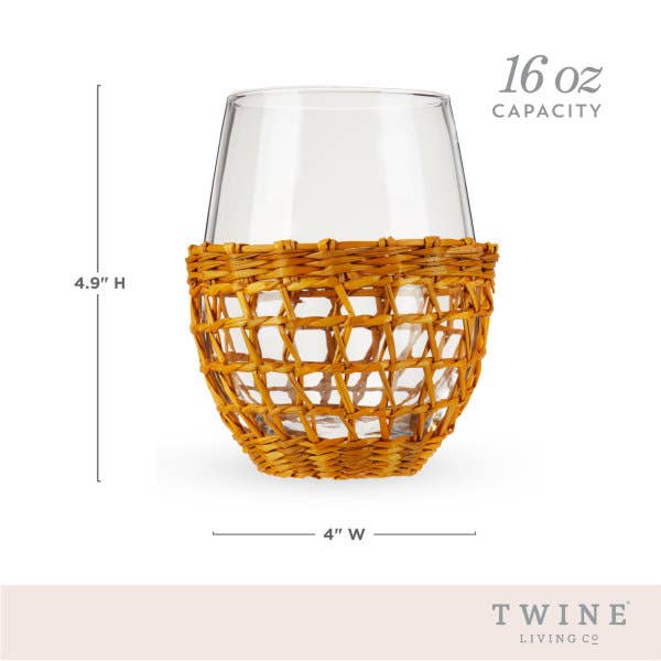 Bring carefree coastal charm to your glassware. Clear stemless wine glasses wrapped in seagrass netting recall fisherman floats, tiki cocktails, and the slow pace of island life—perfect for a small cabin on an ocean bluff or in a modern home with a beachy aesthetic.