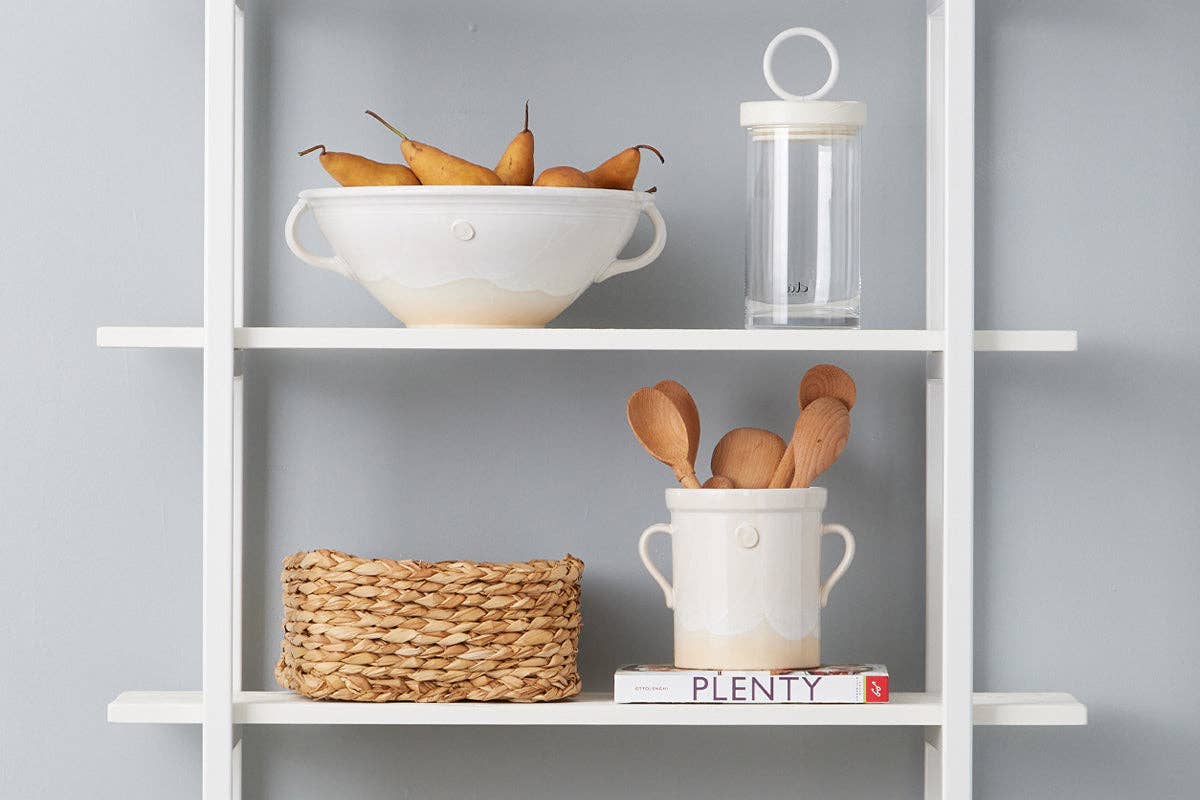 Handcrafted from white European clay, the Handthrown Pottery Collection is created by European artisans on an original potter’s wheel. The pieces are inspired from classic European kitchens, mixing traditional designs with contemporary style. While each item is different and will vary due to the handcrafted technique used to create them, each piece boasts a unique lush glaze to enhance authenticity. The raw clay is left untouched on the bottom, while the top portion is dipped in a warm, white lead-free, non-toxic glaze for the perfect mix of traditional design and contemporary style.