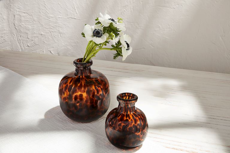 The Small Tortoise Glass Vase features a charming design with a tortoise shell pattern, adding an elegant touch to any space. Its compact size makes it ideal for small floral arrangements or as a standalone decorative piece.