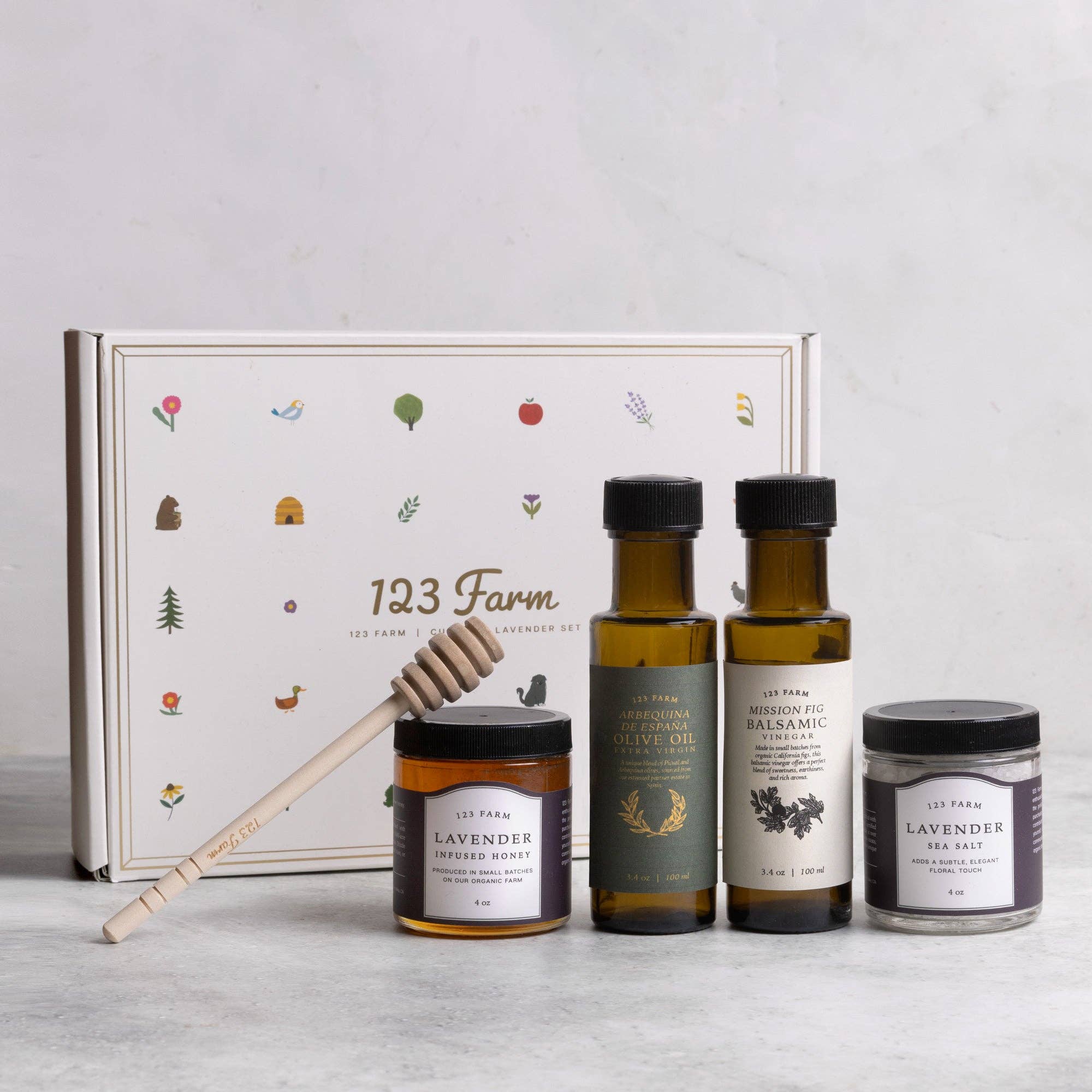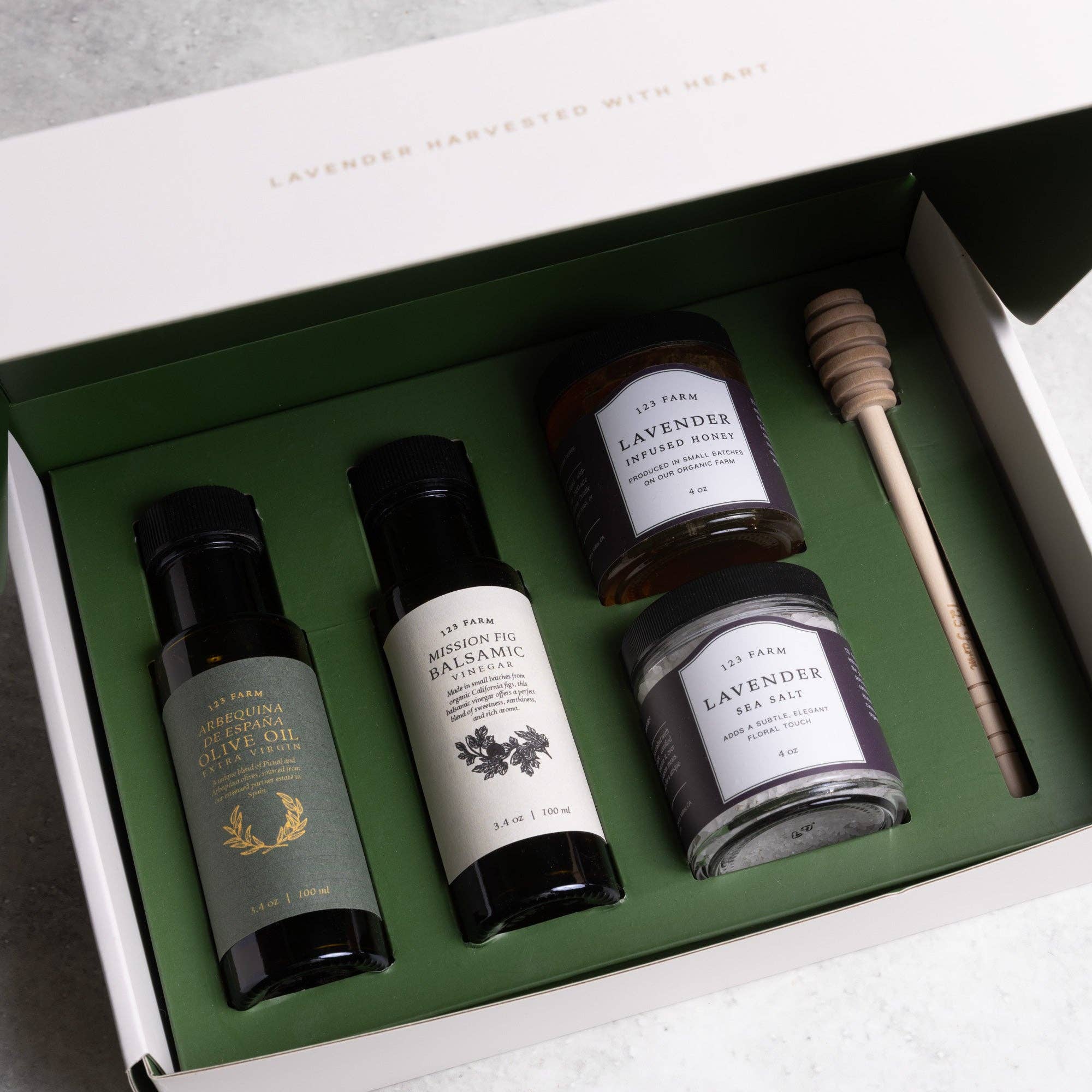 Set includes: 3.4 oz Spanish olive oil, 3.4 oz Mission Fig Vinegar, 4 oz Lavender Honey, Wooden Honey Stick, and 4 oz Lavender Salt
