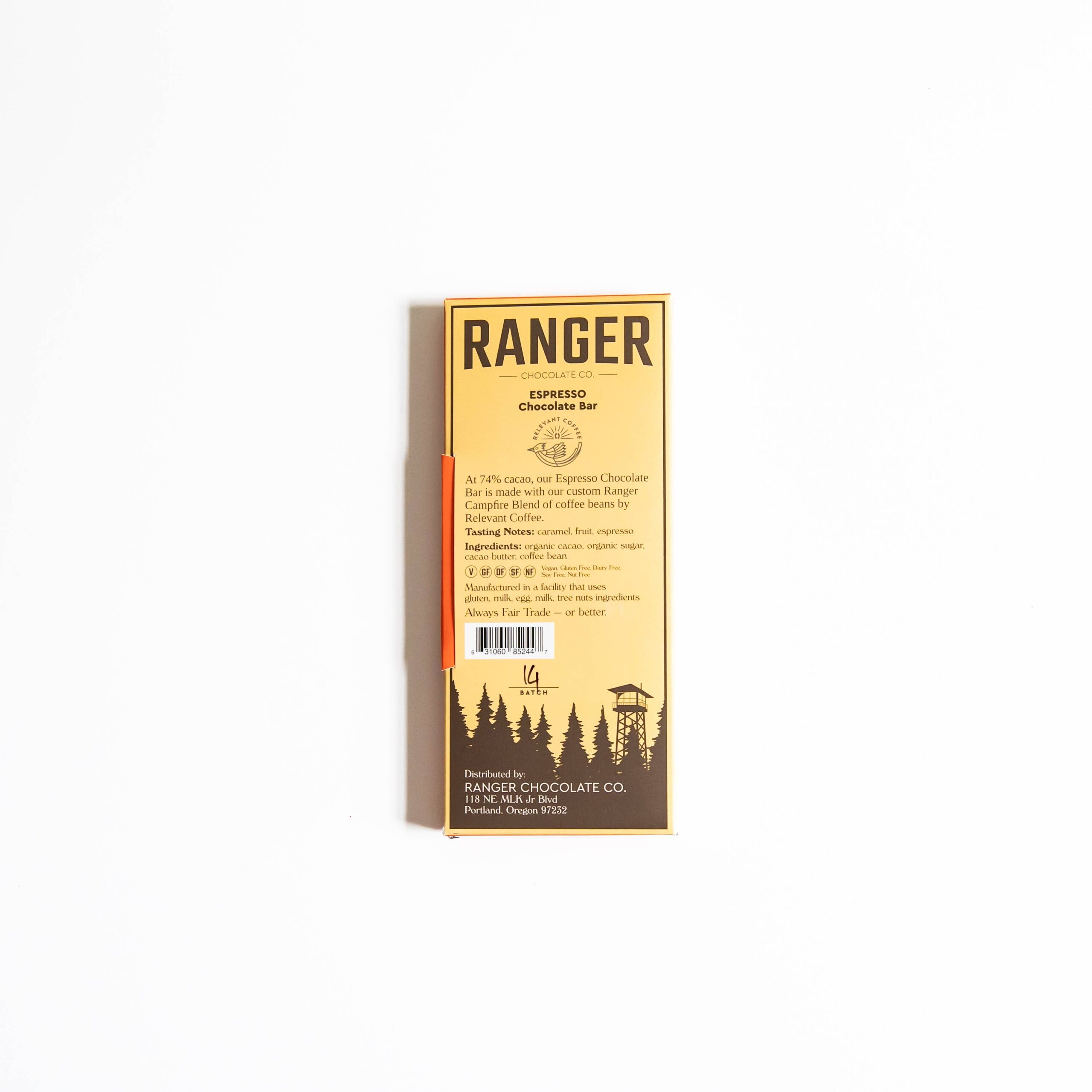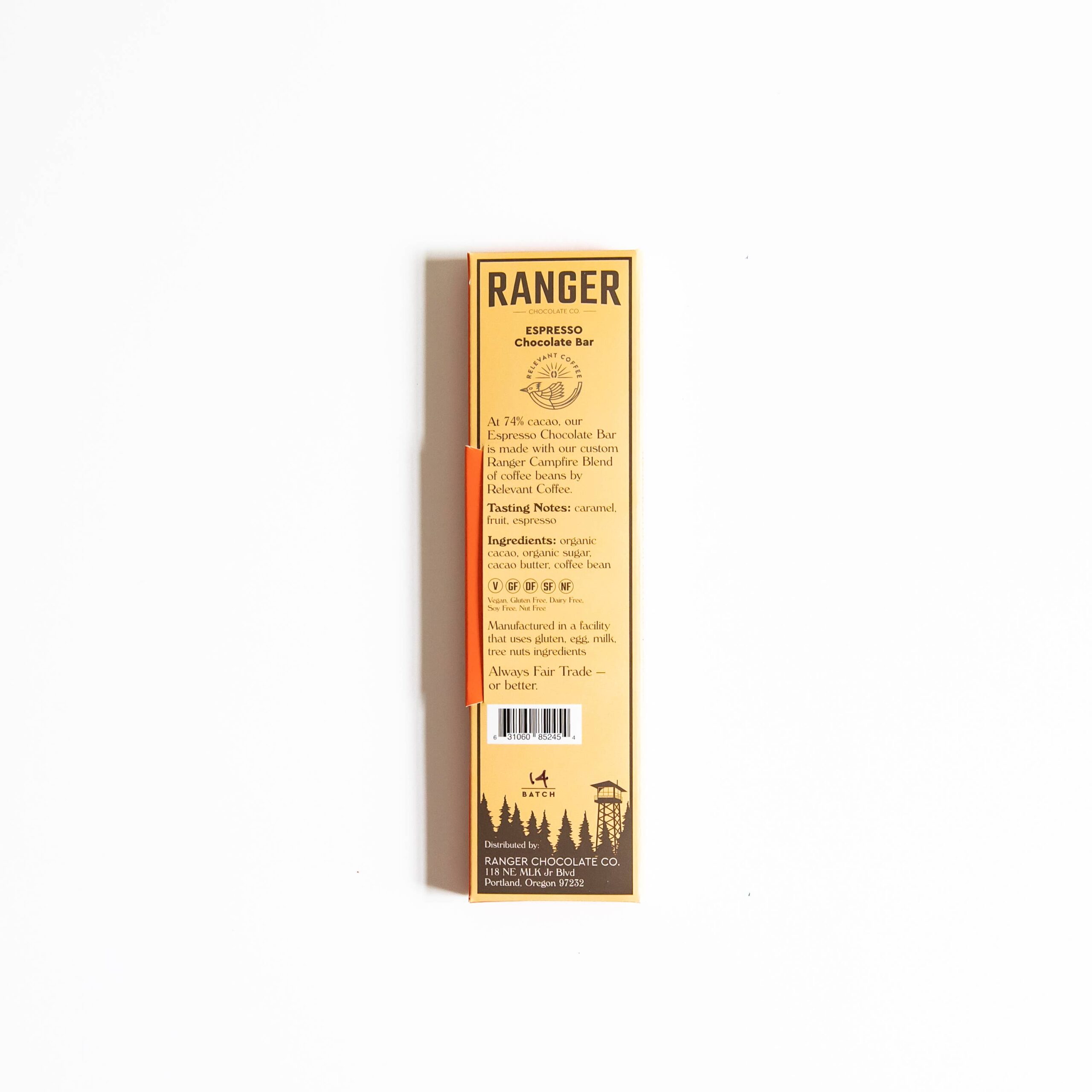 At 74% cacao, our Espresso Chocolate Bar is made with our custom Ranger Campfire Blend of coffee beans by Relevant Coffee.