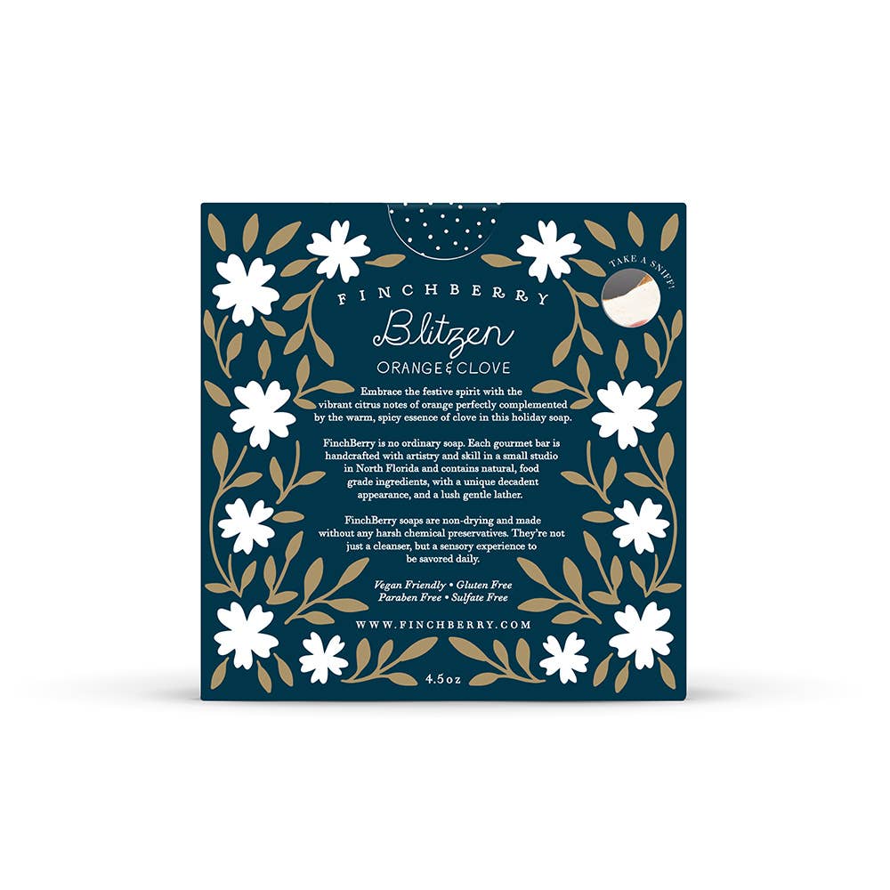 Celebrate the holiday season with Blitzen Soap, a delightful Christmas stocking stuffer. This festive soap features vibrant citrus notes of orange paired with the warm, spicy essence of clove. Crafted with purified water and saponified oils of organic olive, organic coconut, palm, and shea butter, it offers a luxurious lather. Enhanced with select essential and/or fragrance oils, mica, oxides, and cosmetic glitter, this soap is both beautiful and nourishing. Give the gift of FinchBerry this Christmas! Features: – Made with olive, coconut, and palm oils with shea butter – Infused with essential and/or fragrance oils – Contains mica, oxides, and cosmetic glitter – Perfect for holiday gifting – Vibrant citrus and warm clove scent – Ideal for stocking stuffers