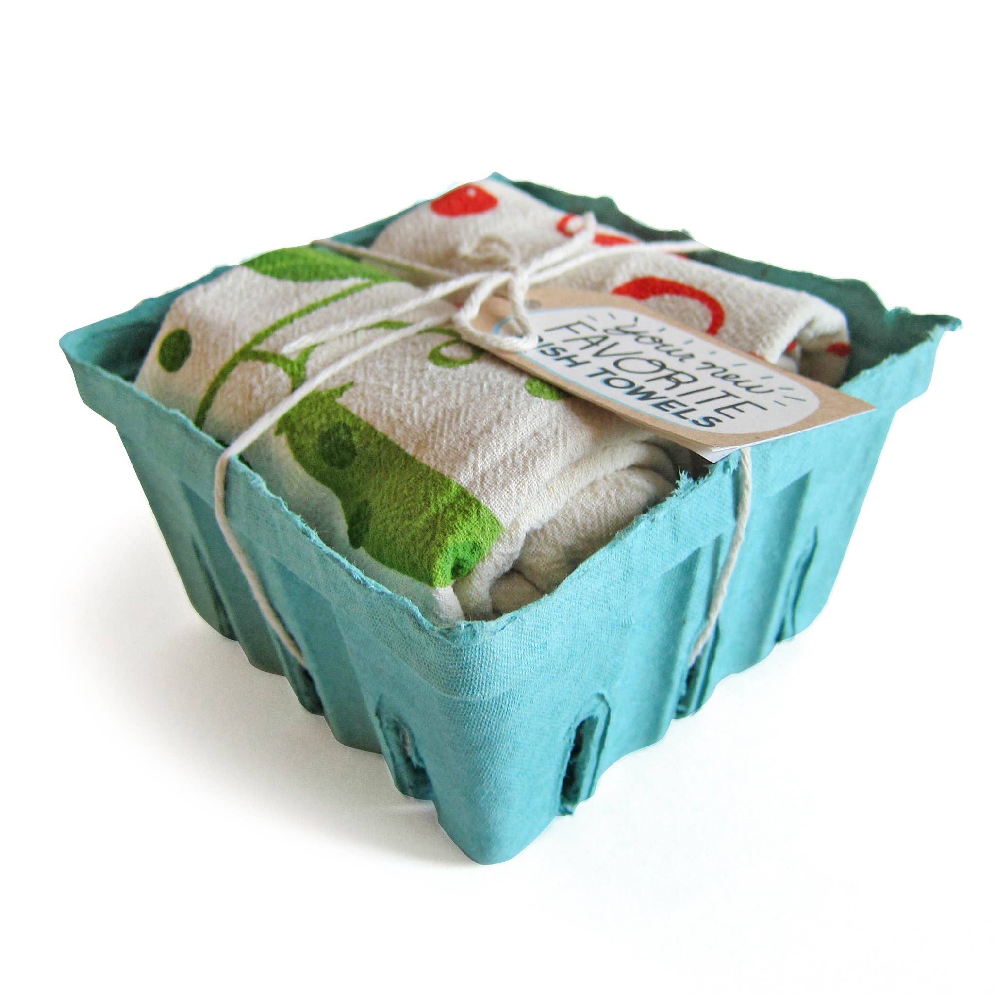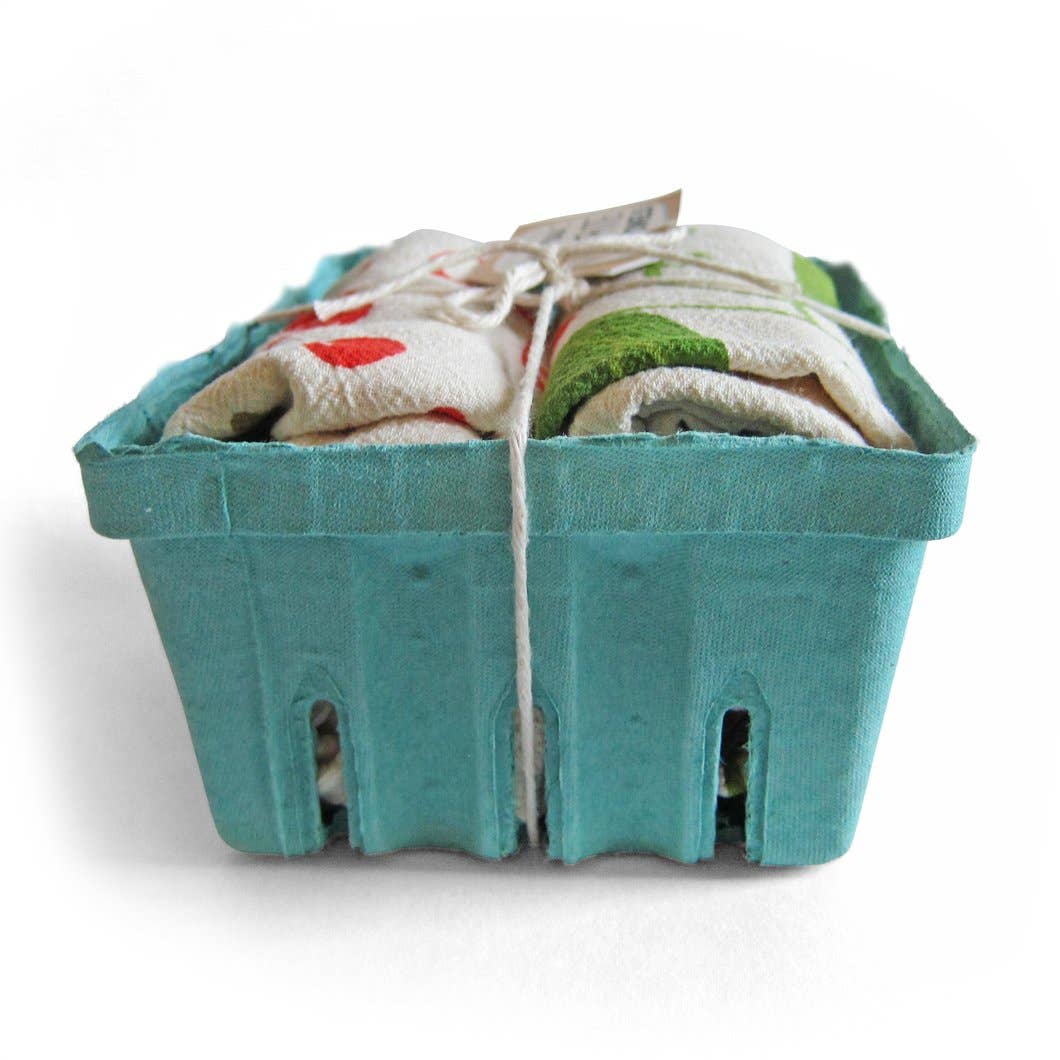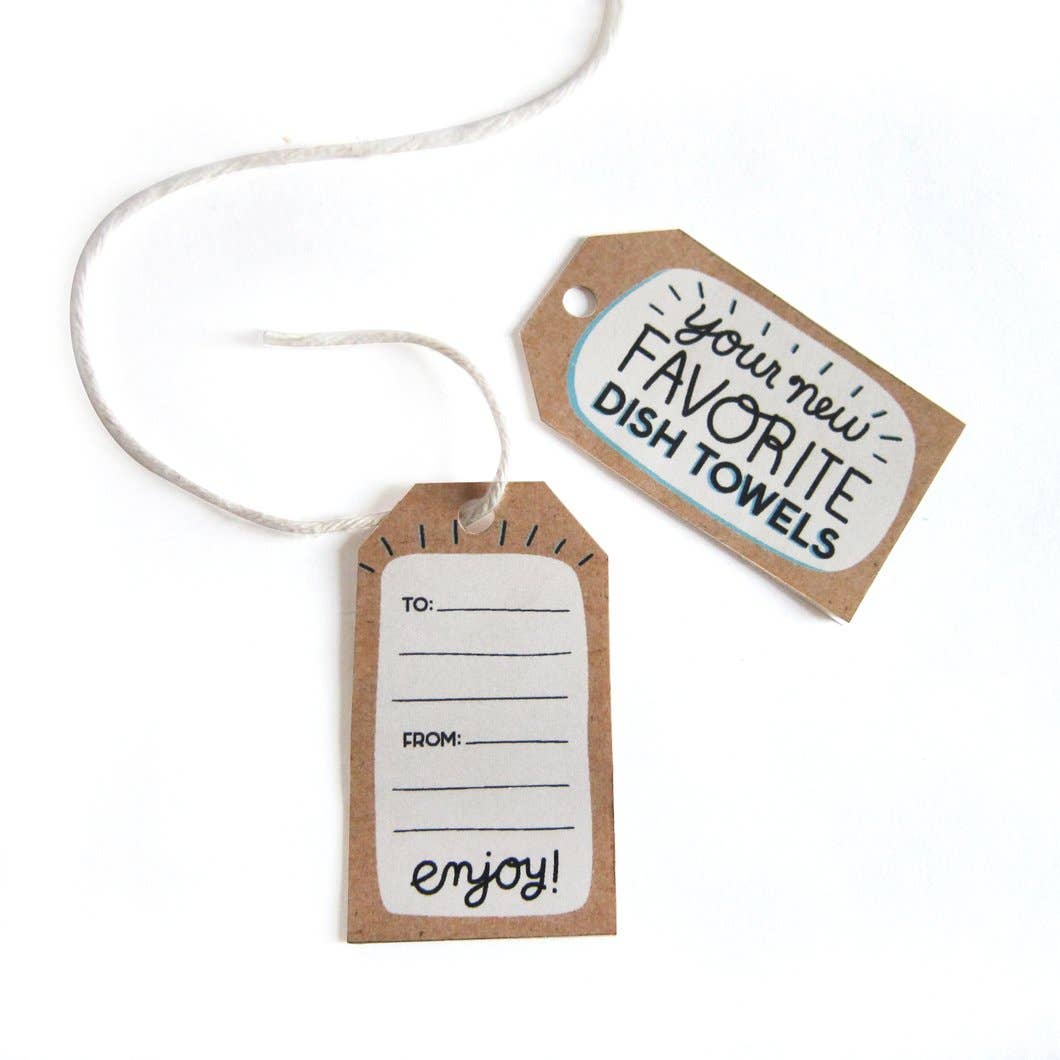 Our dish towel gift sets are packaged up ready for gifting this holiday season! They come with a hang tag to make gifting even easier for your customers, and the label on the bottom shows what the full towel designs look like.
