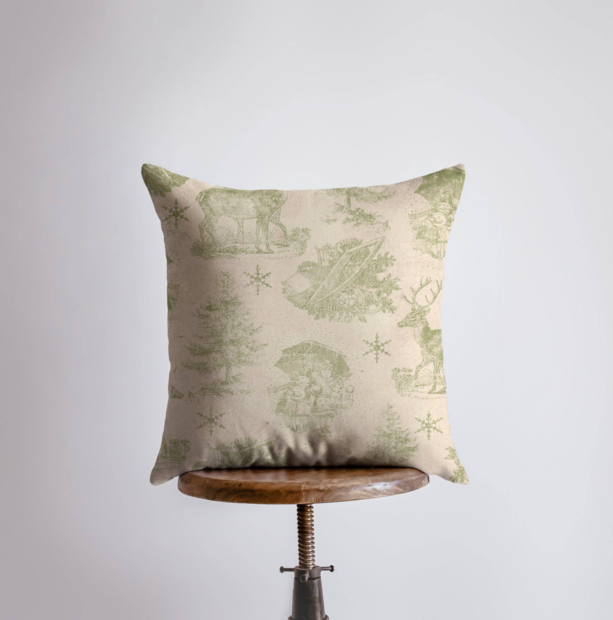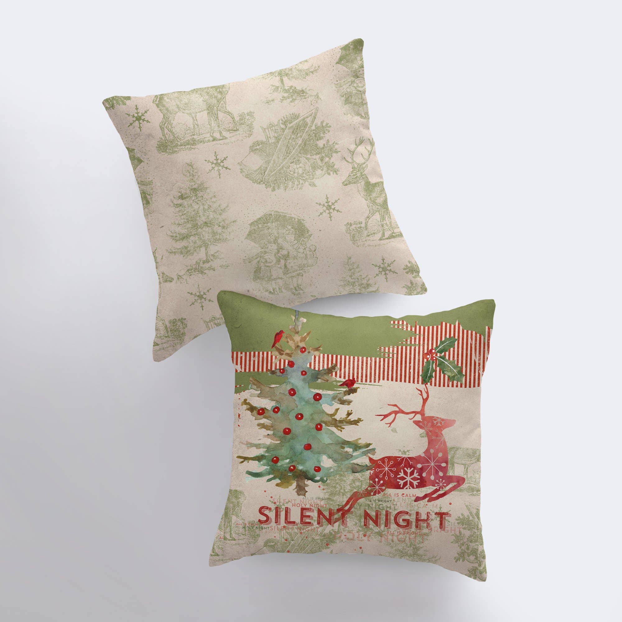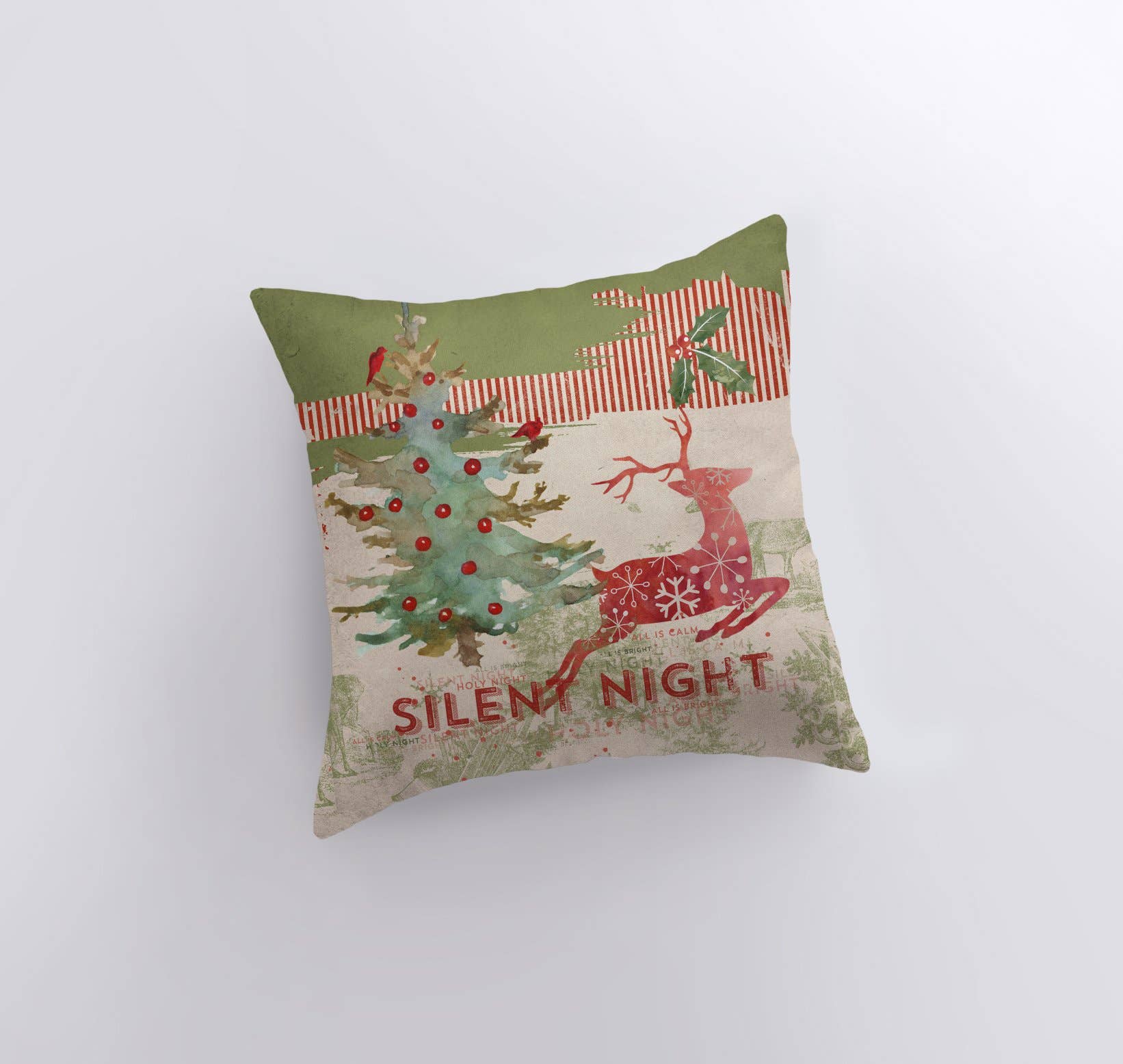100% Hand Made. Made in America. Part of our vintage holiday wrapping paper collection, our Silent Night design with a decorated tree and bounding reindeer screams Christmas, yet isn’t too demanding of your attention. Soft and festive, this pillow print and its counterparts will decorate your home or cabin with seasonal color and give everyone the coziest feels of the year! Front: watercolor tree and red reindeer with “Silent Night” in red at bottom • Back: white with green stamps of reindeer, trees, and snowflakes • Fabric: Cotton / Polyester Blend – Nicely woven, sturdy fabric • Closure: Concealed Zipper  Cover & Insert, 14×14 Inches