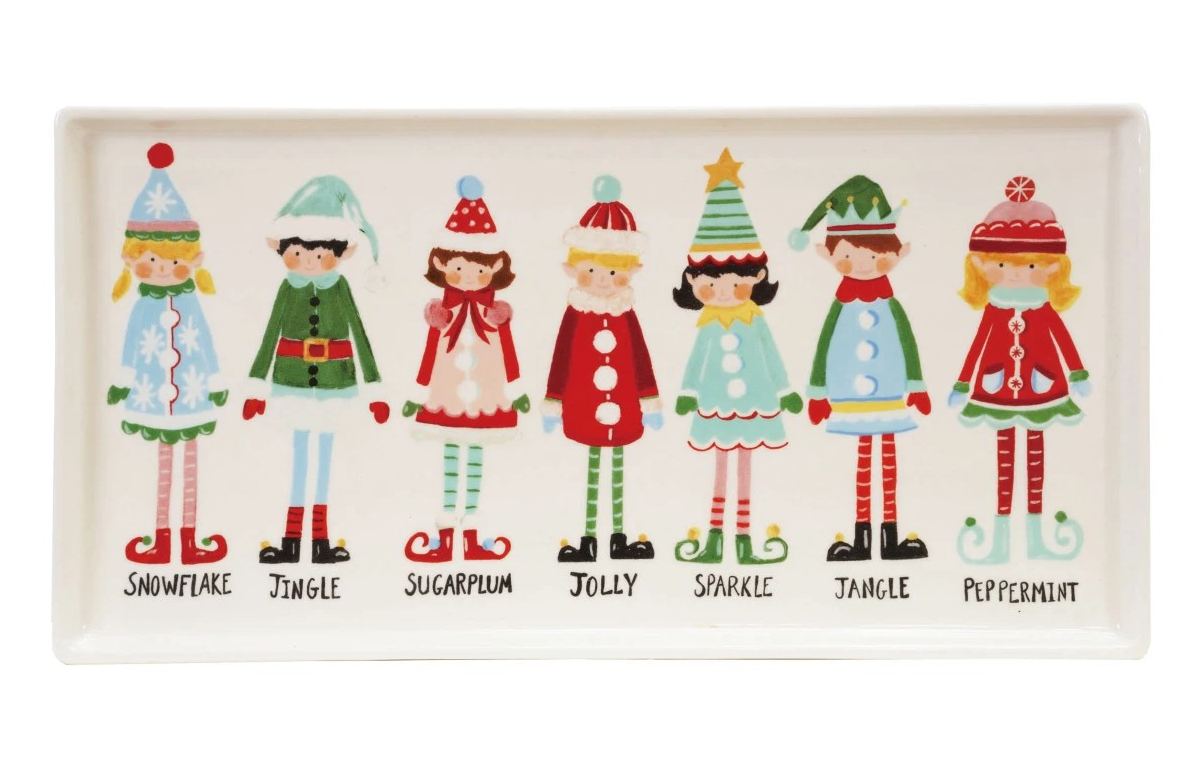 This stoneware platter features a charming Santa’s Elves design in vibrant, festive colors, perfect for holiday gatherings. Handcrafted with care, it offers both durability and versatility for serving treats or displaying holiday décor.