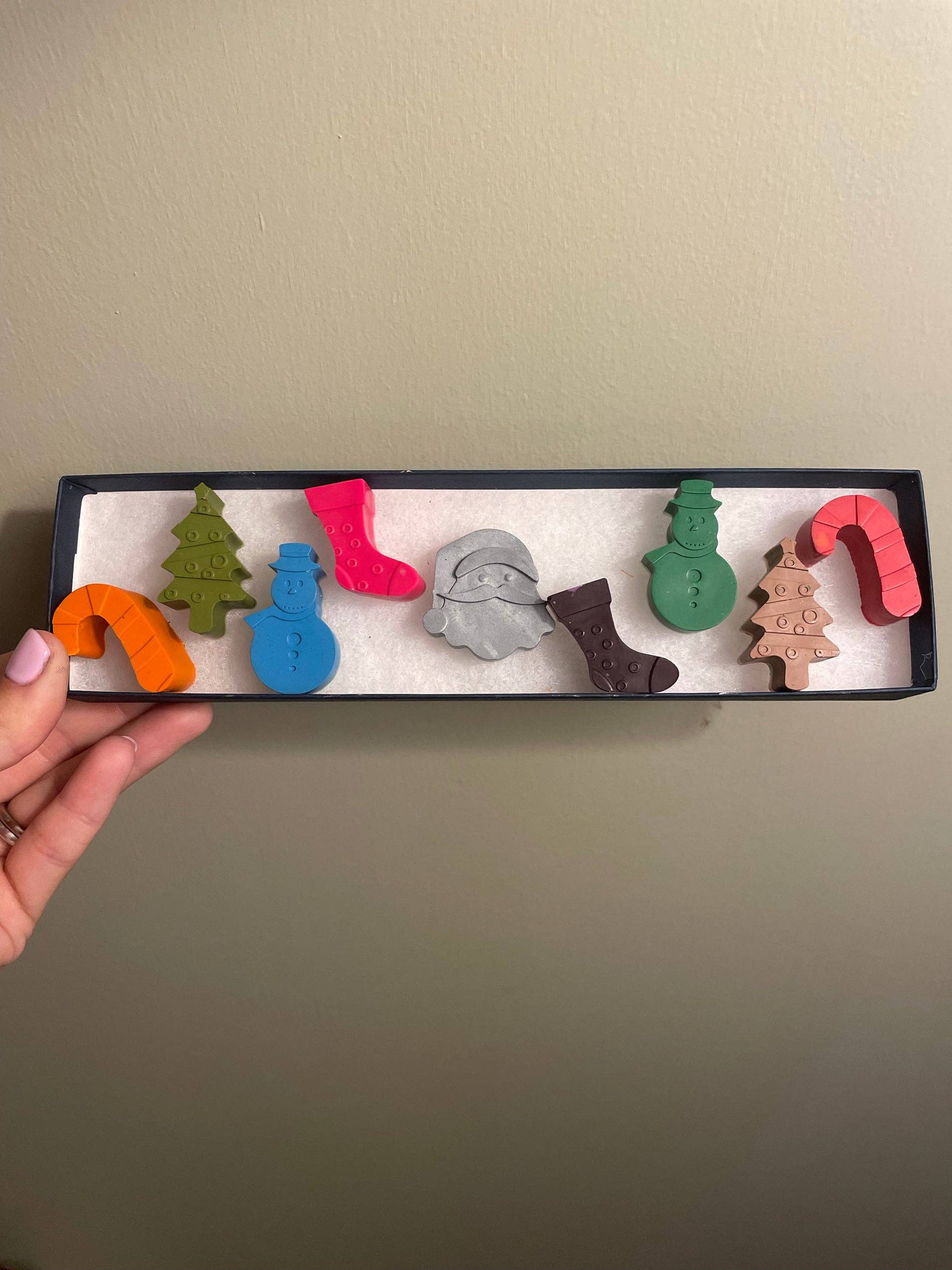 A selection of Christmas shaped, hand poured vibrant wax crayons. These crayons include shapes such as snowman, stocking, candy cane, Santa, Christmas tree, present