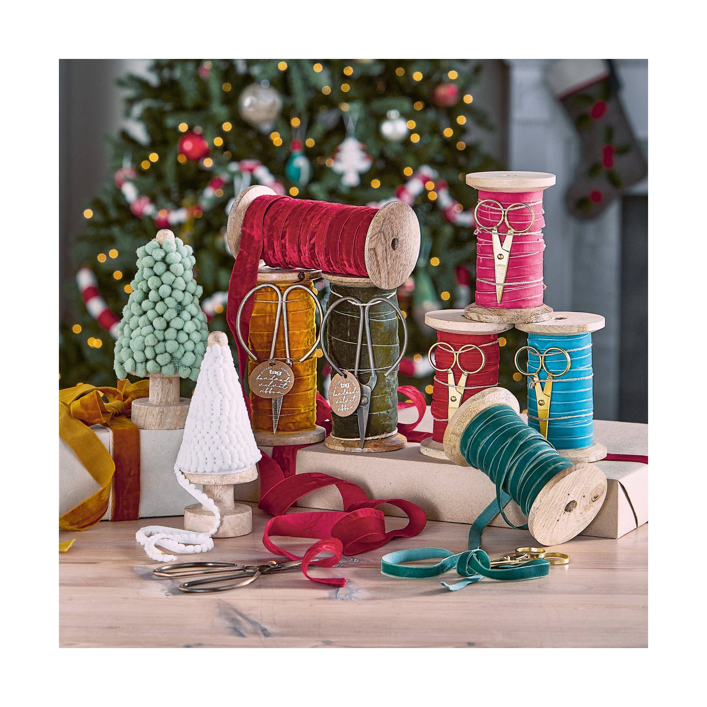 Artisan crafted ribbons are the perfect accessory for the season! Elevate gift wrapping, hang ornaments in style, accessorize wreaths and flower bouquets, or use as an accent to any decor project for the home. Wrapped around mango wood spool and held by antique pin. Comes with iron scissors.