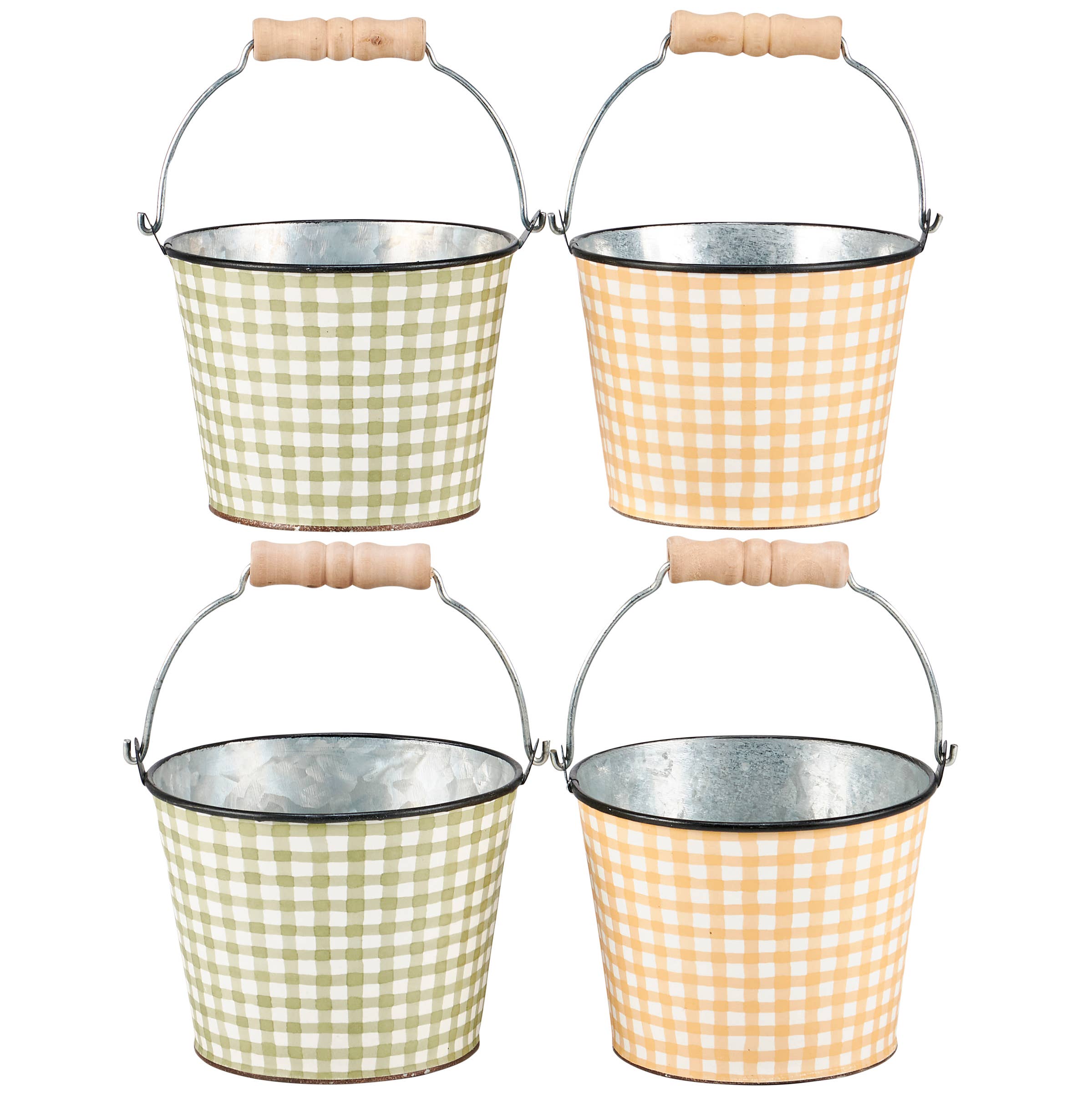 A metal buckets from our Easter & Spring Collection displaying spring inspired hand painted designs on each. Bucket designs feature spring color gingham patterns with various scenes of bunnies surrounded by spring flowers. This buckertb is perfect for displaying greenery or including in an Easter display. Accessories and greenery pictured not included. Our Flower Bunnies bucket set includes metal handles with wooden grips for easy carrying and stack inside each other for easy storage. A rustic set of seasonal home accents with a variety of display options.