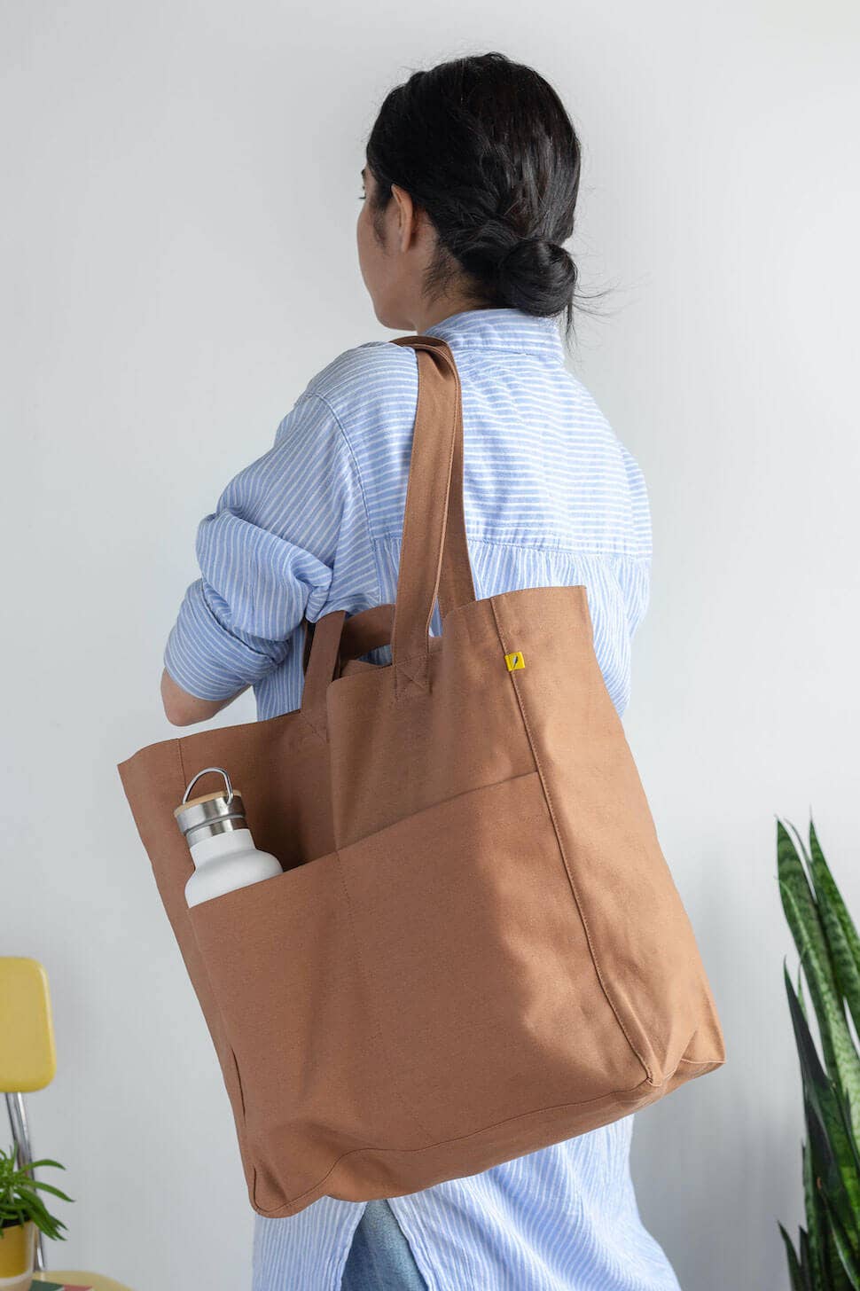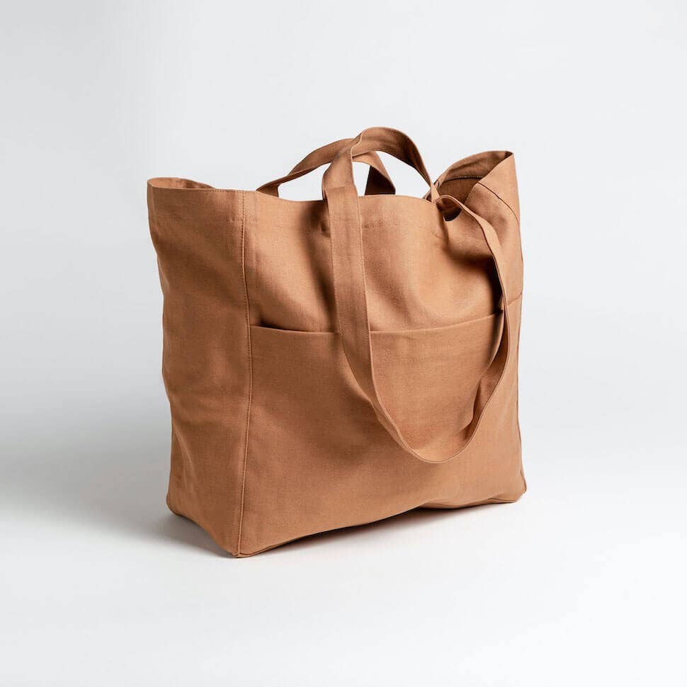 Oversized, easy, multi-pocket tote. Three large exterior pockets + three interior pockets. Comfortable carry straps + short handle straps. Sustainably and ethically handmade in India with 100% GOTS-certified organic cotton. Machine Washable.