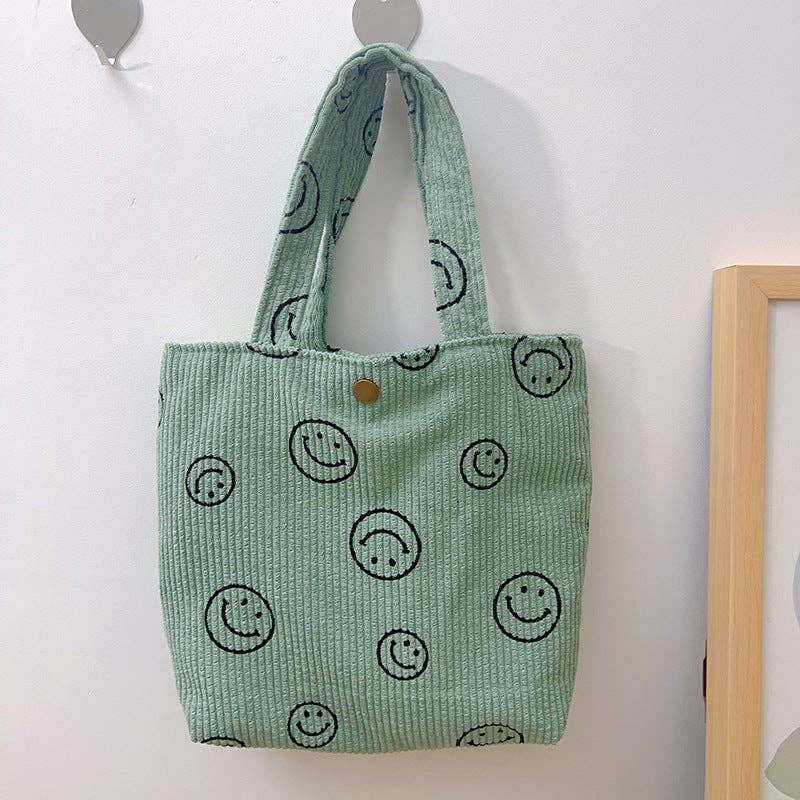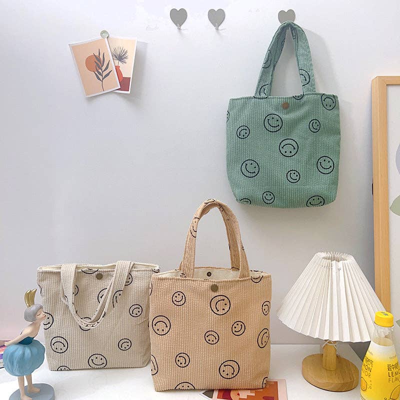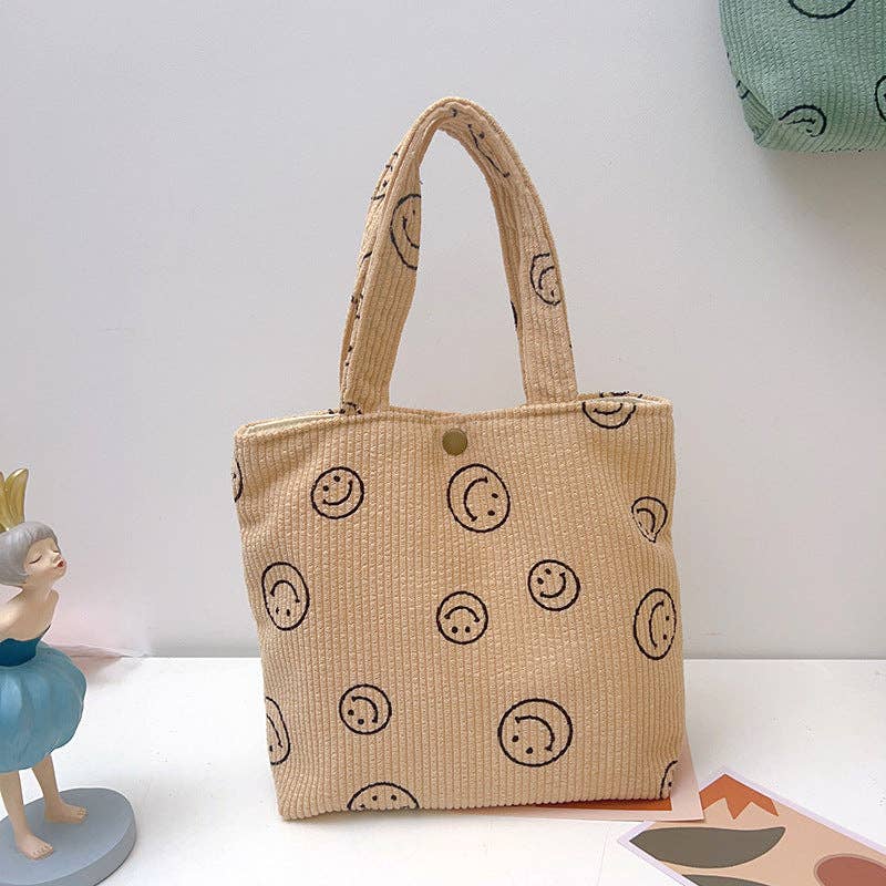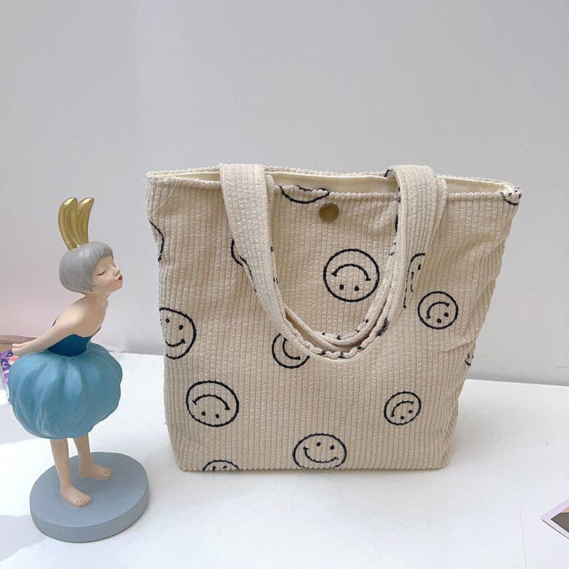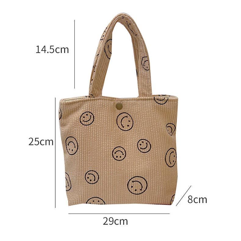 Charming Design: This tote bag features a playful smiley face pattern on soft corduroy material, blending fun with fashion. Quality and Dimensions: Made from high-quality corduroy, it measures 25×29 cm, ensuring durability and ample space for your essentials. Versatile and Trendy: Its unique design and perfect size make it suitable for various occasions, from casual outings to daily commutes.