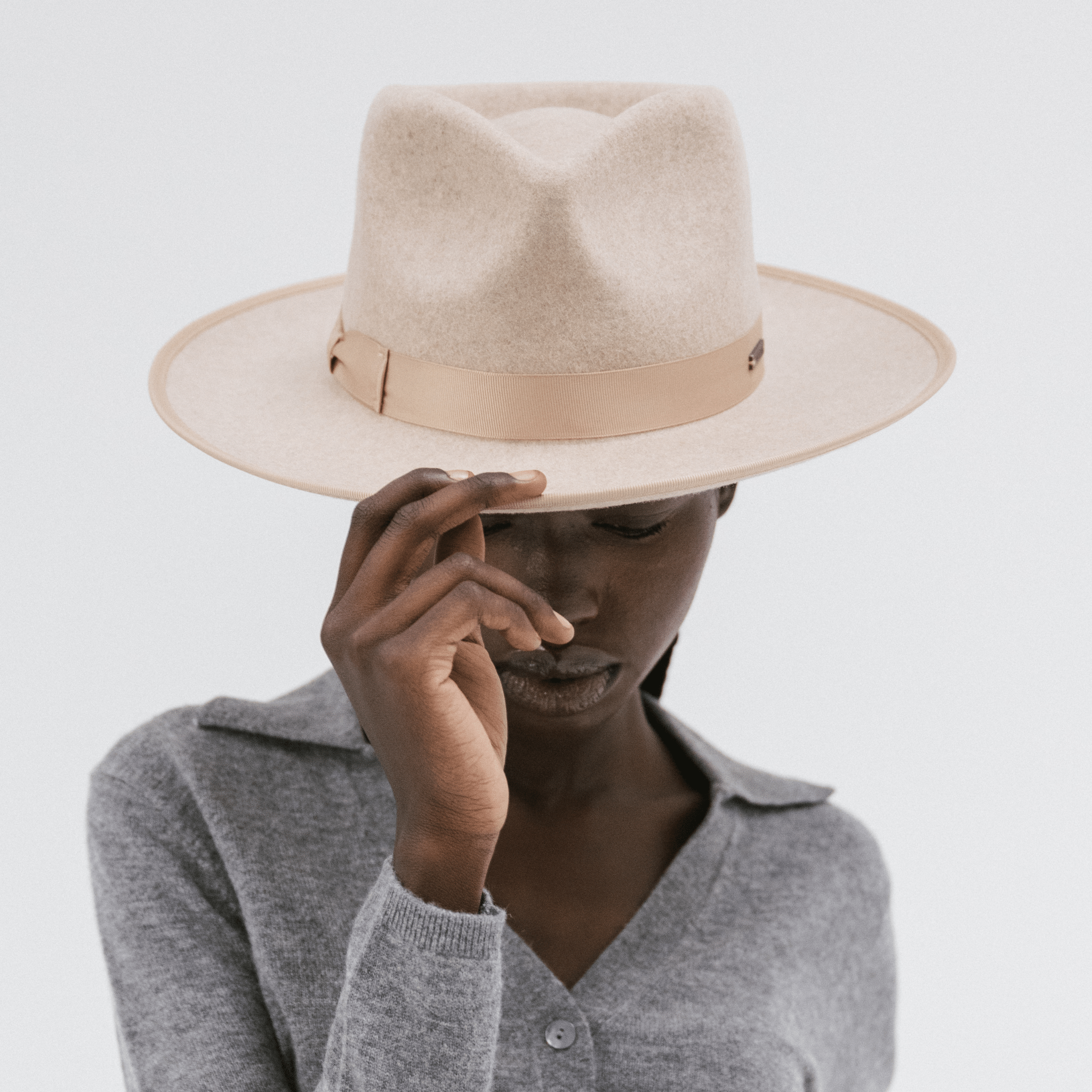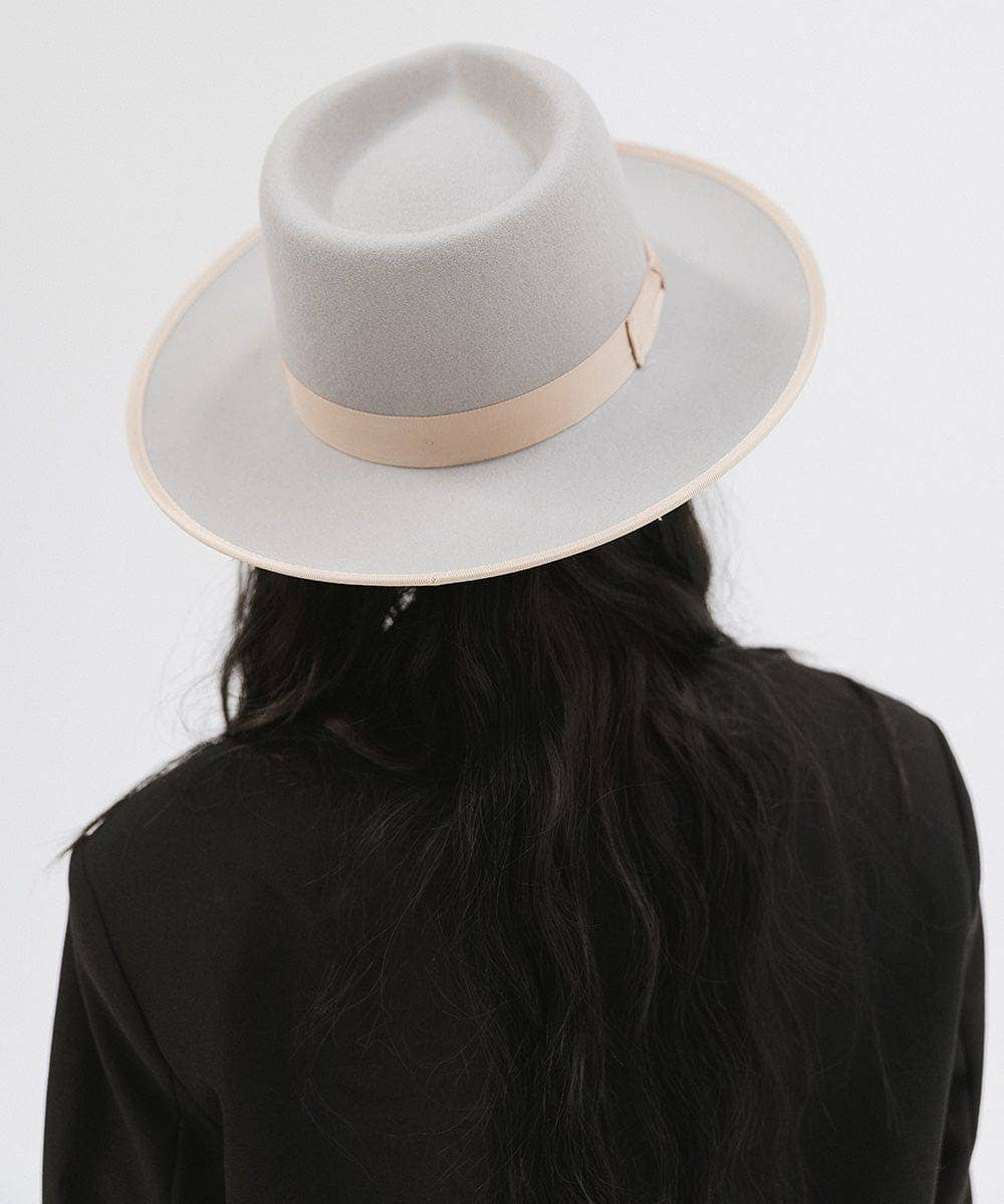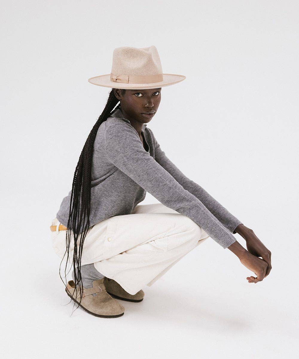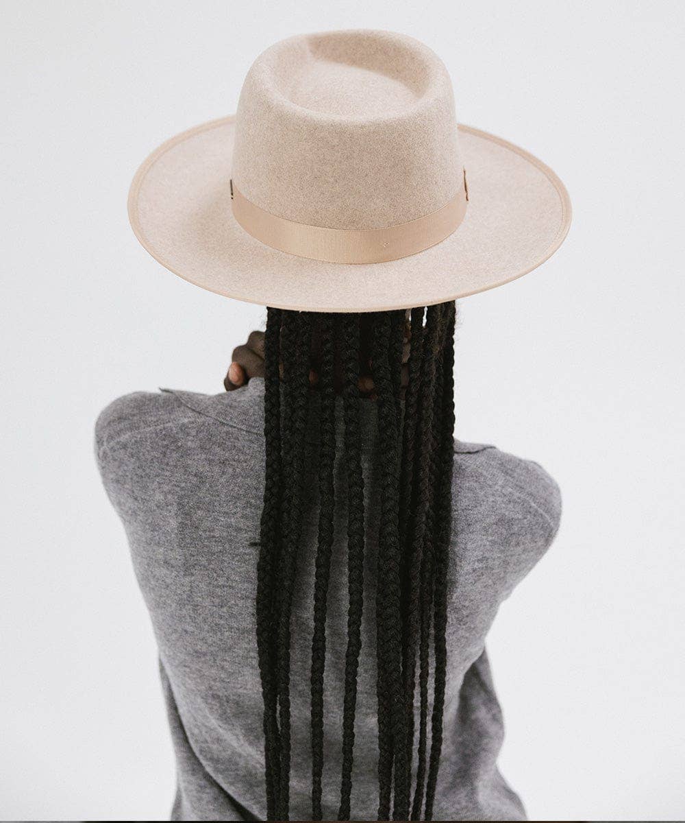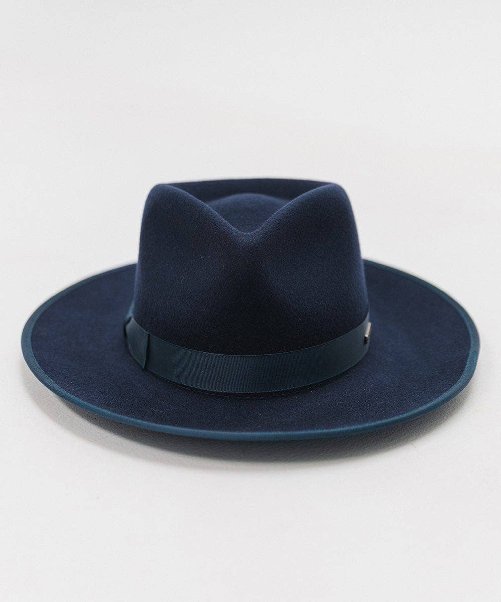 The Monroe Rancher is a hat with a teardrop shaped crown, stiff upturned brim, and is paired with a tonal grosgrain band. These beautiful combinations make this felt fedora hat a classic.
