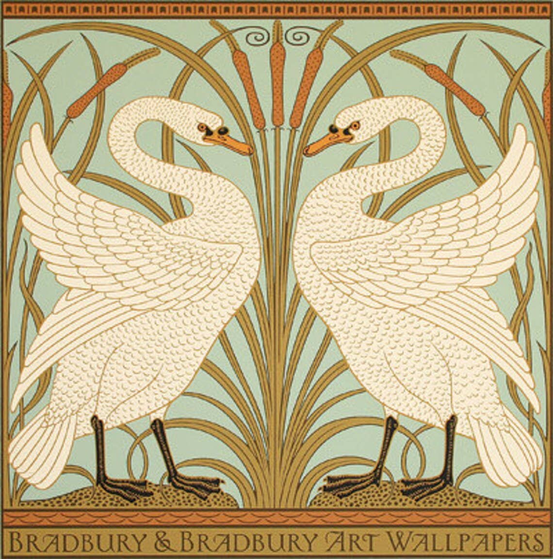 This elegant tapestry pattern is inspired by Walter Crane, a British painter, painting Swan, Rush and Iris. Originally a wallpaper design in the Arts and Crafts style, it depicts two swans facing each other, profiled in perfect symmetry. Crane painting Art Nouveau textiles and wallpaper that became internationally popular.