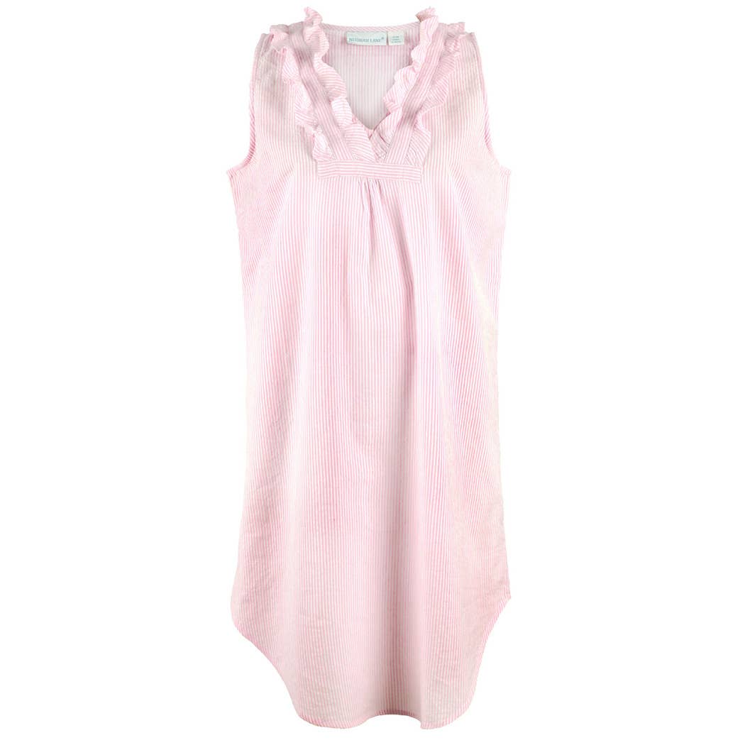 Sleeveless nightgown made of soft, 100% cotton yarn-dyed woven seersucker. Simple ruffles along the v-neck. Machine wash warm, tumble dry low.